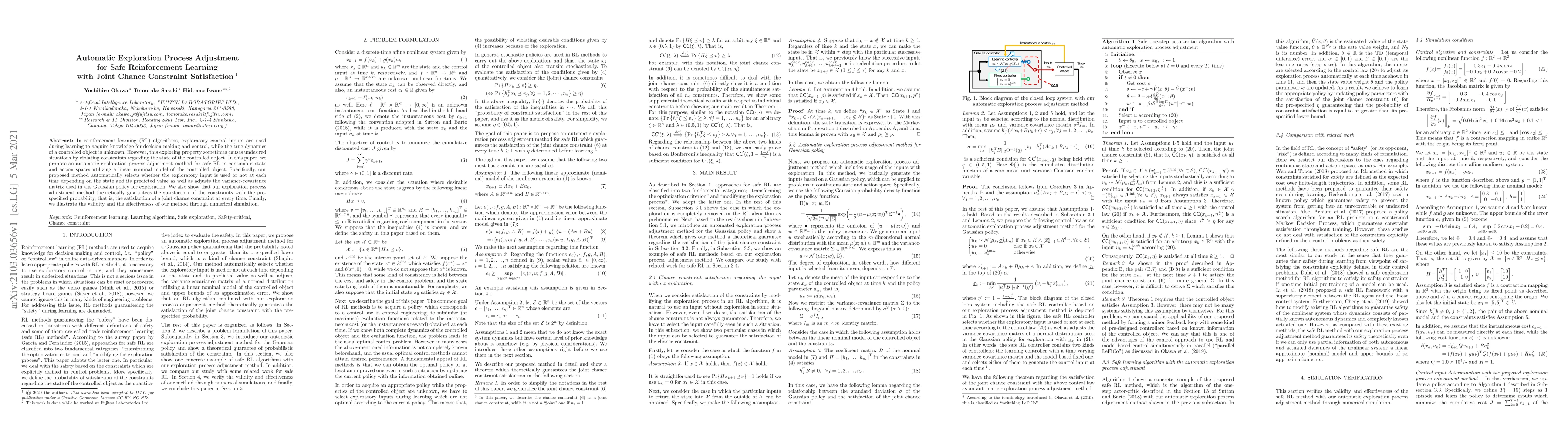 This paper proposes an automatic method to adjust exploration in reinforcement learning to ensure safety while satisfying joint chance constraints. The method dynamically selects the use of exploratory inputs and adjusts the exploration variance-covariance matrix based on the state and predicted values, theoretically guaranteeing constraint satisfaction with a specified probability.