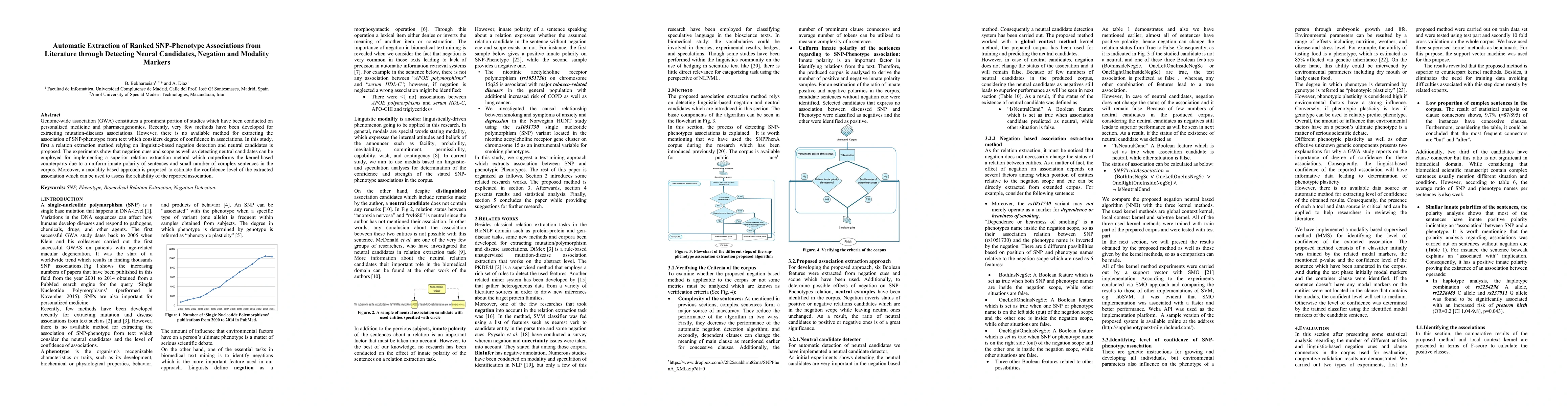 This paper proposes a method for automatically extracting ranked SNP-phenotype associations from literature by detecting linguistic negation, neutral candidates, and modality markers to assess the confidence level of the associations, which outperforms existing kernel-based methods. The approach estimates the reliability of reported associations, enhancing the utility of extracted data in personalized medicine and pharmacogenomics.