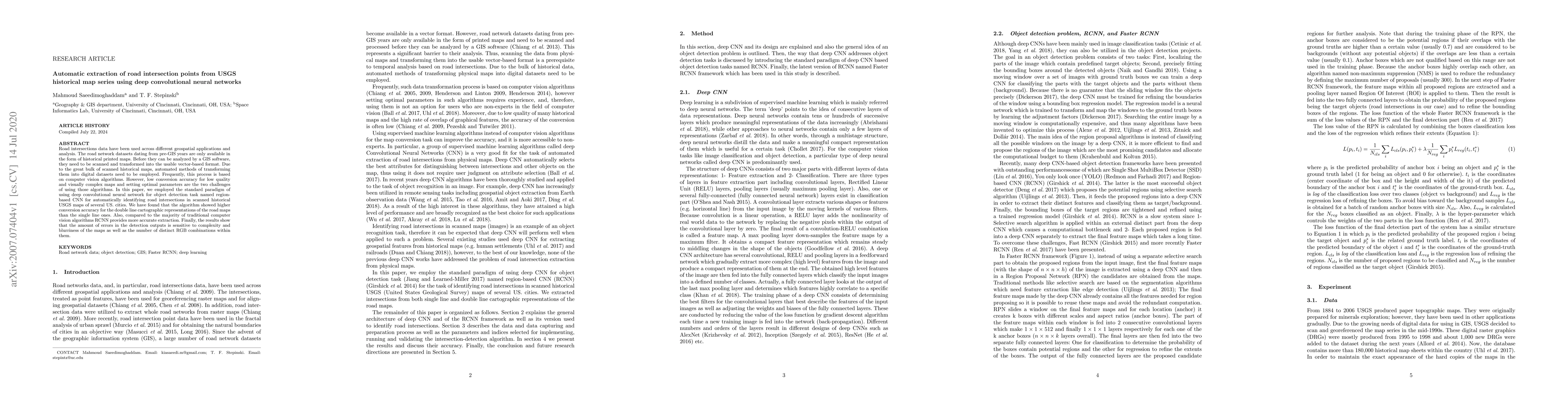 Researchers developed a deep convolutional neural network to automatically extract road intersection points from scanned historical USGS maps, achieving higher conversion accuracy than traditional computer vision algorithms.
