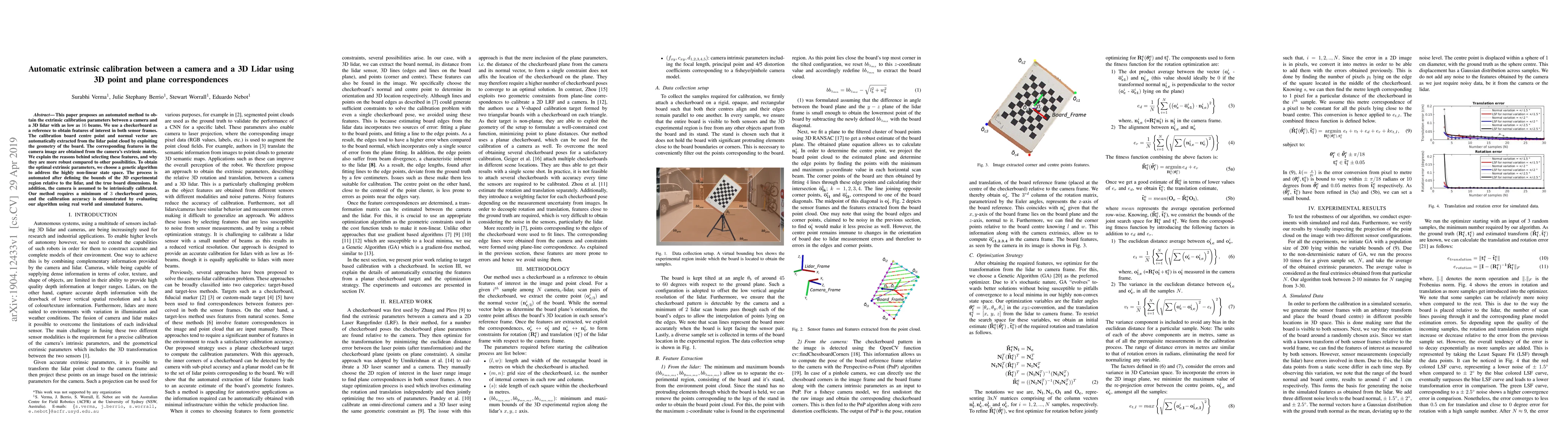 This paper presents an automated method for obtaining extrinsic calibration parameters between a camera and a 3D lidar using 16 laser beams, featuring robust checkerboard features and a genetic algorithm for optimal parameter determination. The process requires a minimum of 3 checkerboard poses and is validated through real and simulated data.