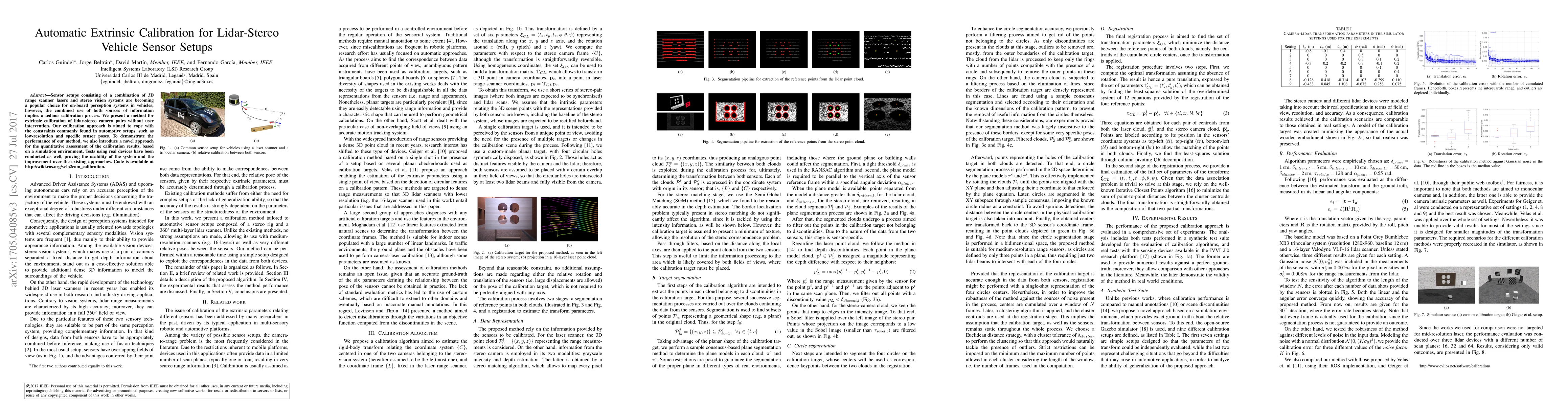 This paper presents an automatic method for extrinsic calibration of lidar-stereo camera pairs in vehicle sensor setups, eliminating the need for user intervention. The method is designed to handle constraints like low-resolution and specific sensor configurations, and it includes a novel quantitative assessment approach using a simulation environment.