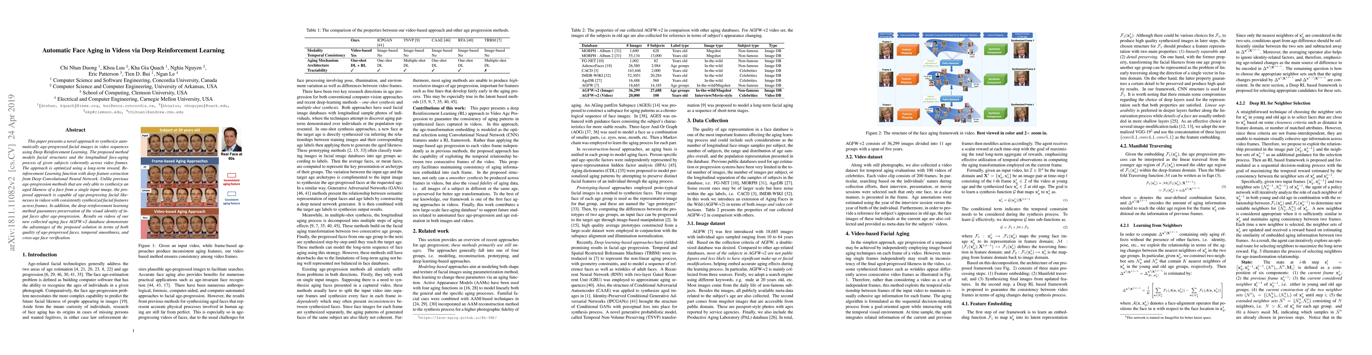 This paper introduces a Deep Reinforcement Learning method for automatically aging facial images in video sequences, ensuring consistent facial features across frames and preserving visual identity. The approach outperforms previous single-image methods, as demonstrated by results on the new AGFW-v2 database.