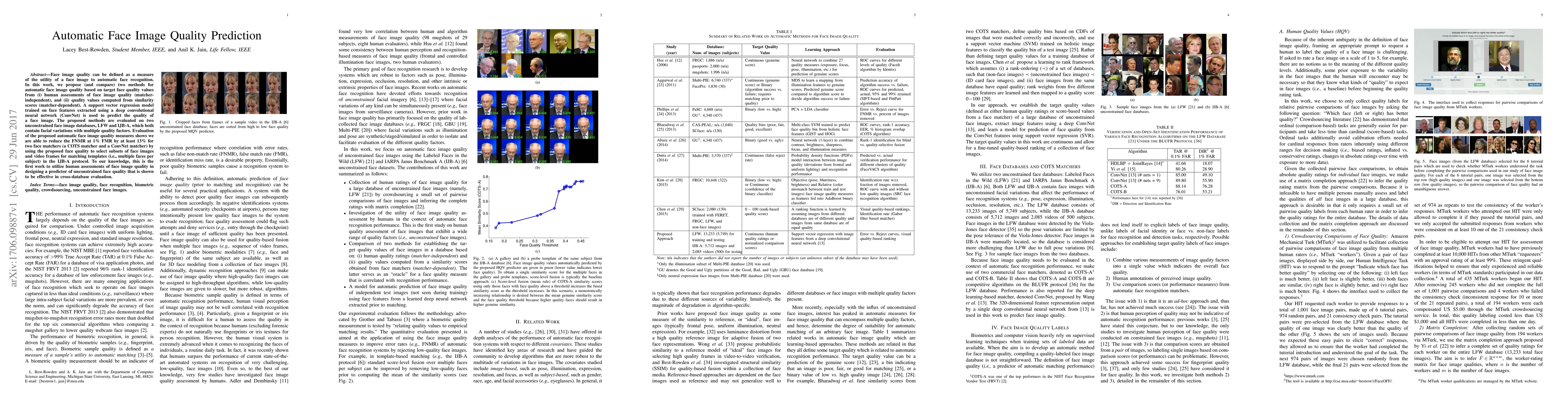 This paper proposes two methods for automatic face image quality prediction based on human assessments and similarity scores, employing a support vector regression model with deep convolutional neural network features. The methods improve face recognition performance by reducing false non-matches by at least 13% on two face image databases.