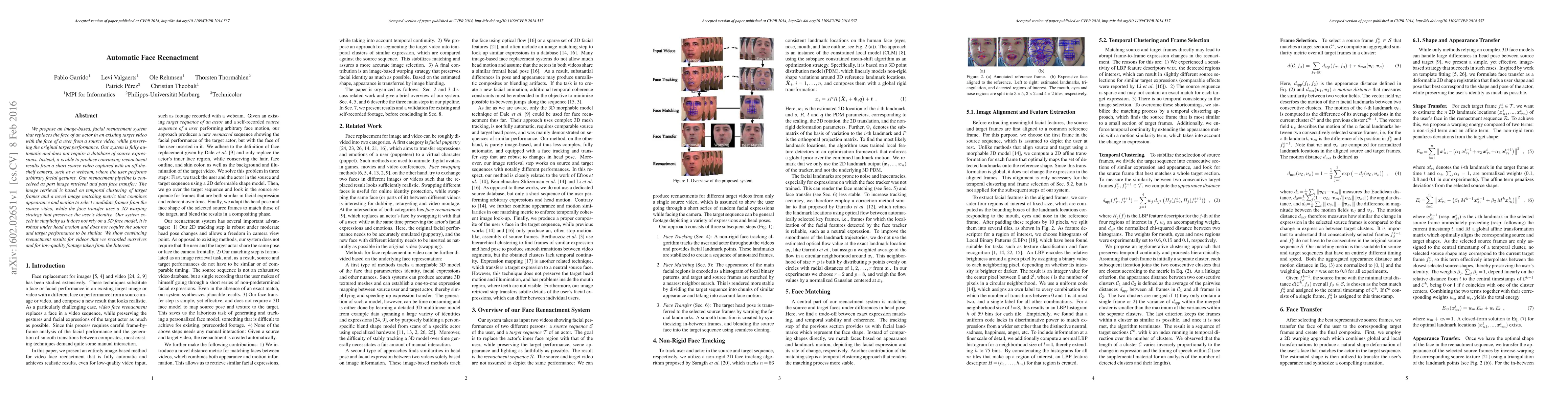 The paper proposes an image-based, automatic face reenactment system that replaces an actor's face in a target video with a user's face from a source video, preserving the target's performance. It uses non-rigid face tracking, face matching based on appearance and motion, and a 2D warping strategy for face transfer, without requiring a 3D face model or extensive databases.