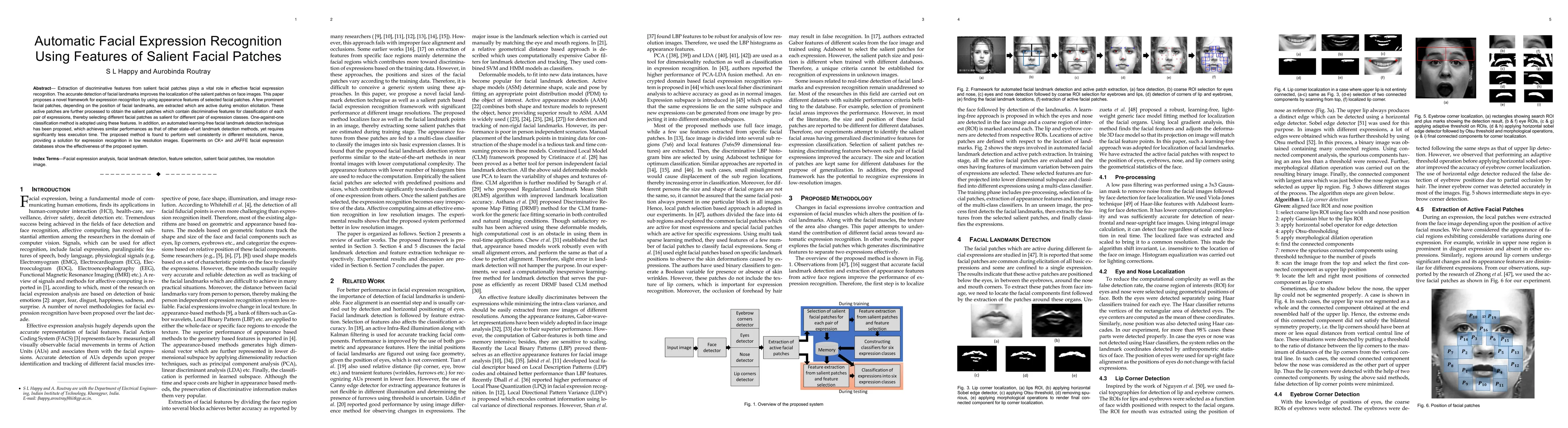 This paper proposes a novel framework for automatic facial expression recognition using discriminative features from salient facial patches, detected via an efficient automated landmark detection technique. The method achieves high performance in classifying expressions, even in low-resolution images, as validated through experiments on CK+ and JAFFE databases.