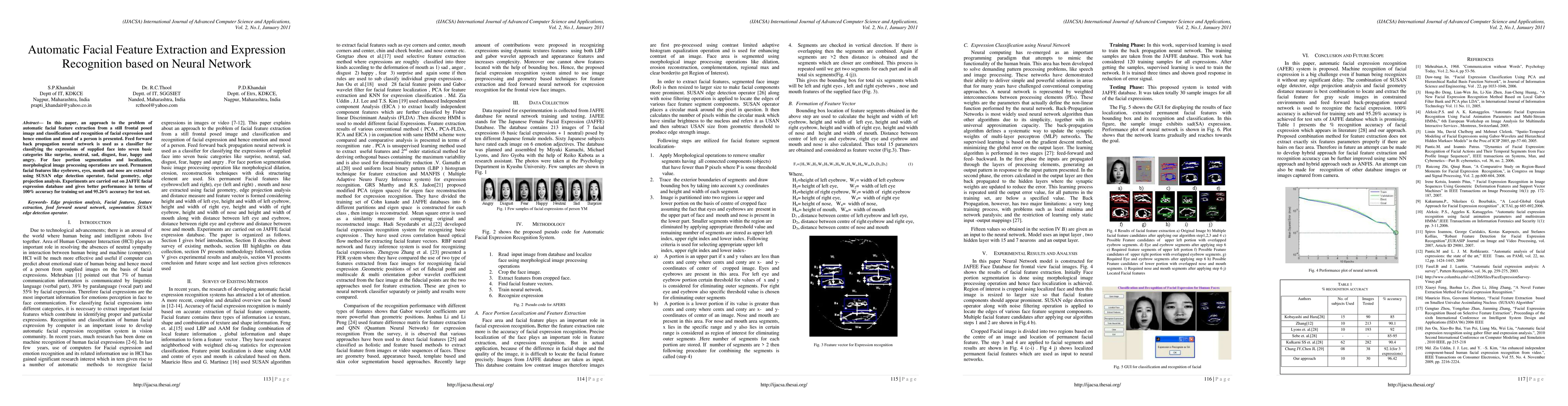 This paper presents a neural network-based method for automatic facial feature extraction and expression recognition from frontal posed images, achieving 100% accuracy on training and 95.26% on the test set using JAFFE database. It employs morphological operations and SUSAN edge detection for feature extraction and classifies expressions into seven basic categories.