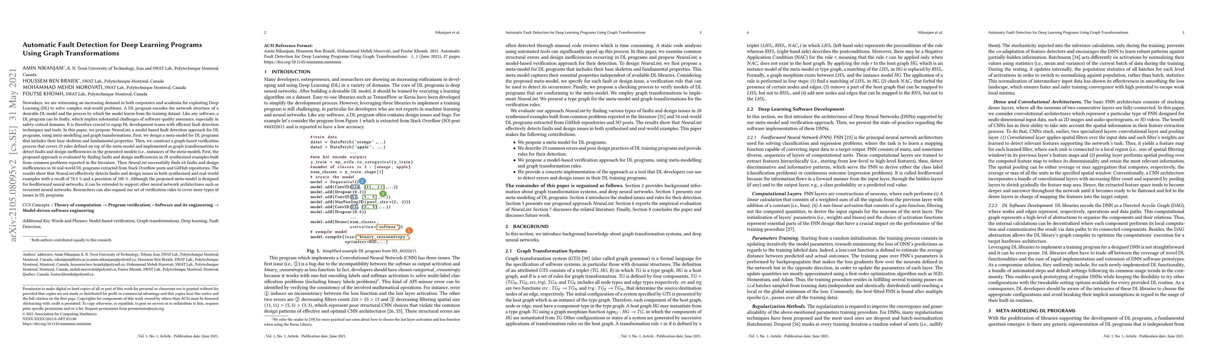 This paper introduces NeuraLint, a model-based fault detection tool for deep learning programs using meta-modelling and graph transformations. The tool effectively identifies faults and design inefficiencies in both synthesized and real-world deep learning models with a recall of 70.5% and precision of 100%.