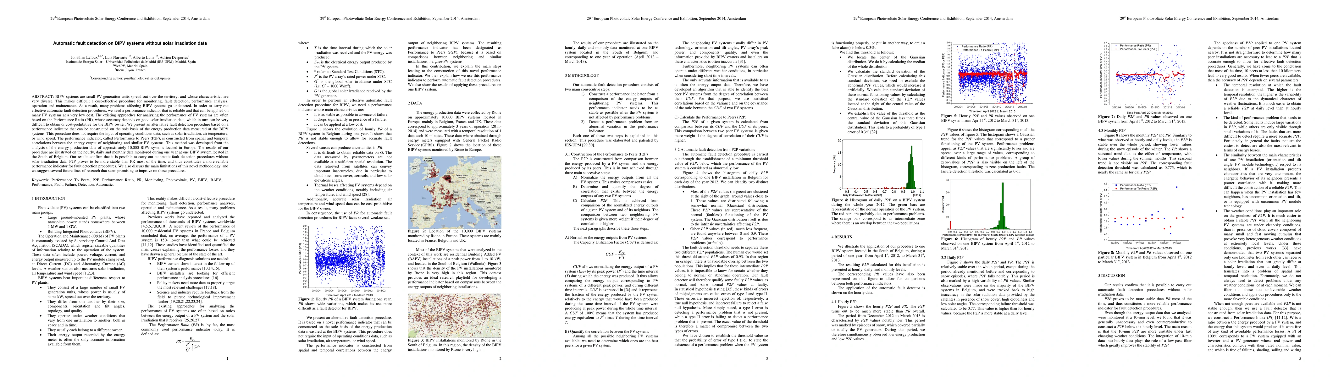 Researchers developed a new method called Performance to Peers (P2P) for automatic fault detection in Building Integrated Photovoltaic (BIPV) systems without needing solar irradiation data. The P2P method uses spatial and temporal correlations between neighboring PV systems to detect faults, proving it more stable than existing methods like Performance Ratio (PR).