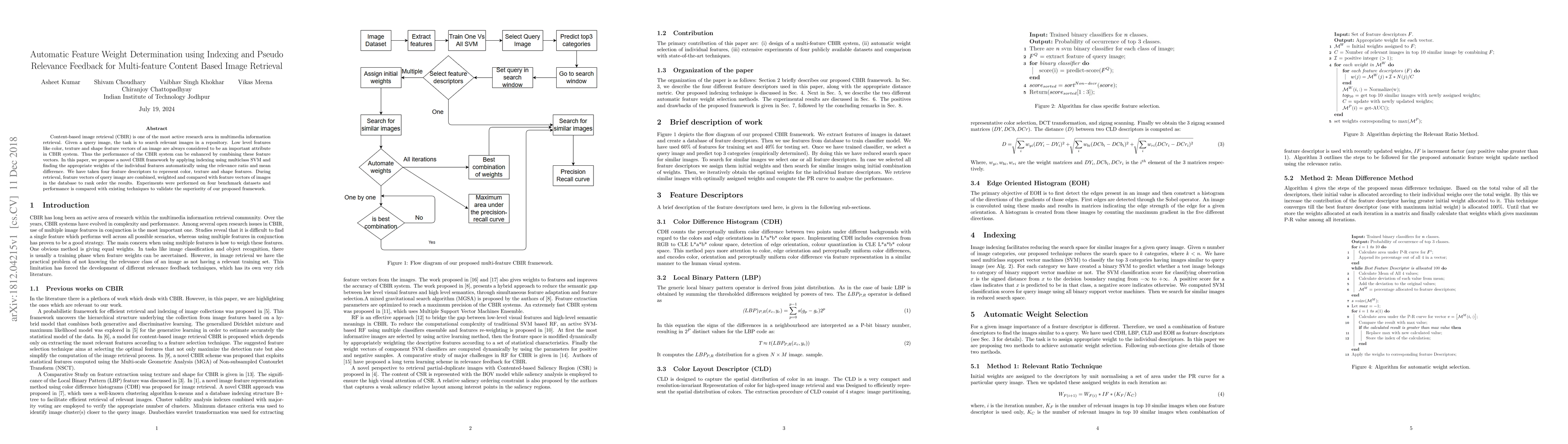 This paper proposes a novel framework for content-based image retrieval (CBIR) that uses multiclass SVM indexing and pseudo-relevance feedback to automatically determine feature weights for color, texture, and shape descriptors. Experiments on benchmark datasets show improved performance compared to existing techniques.