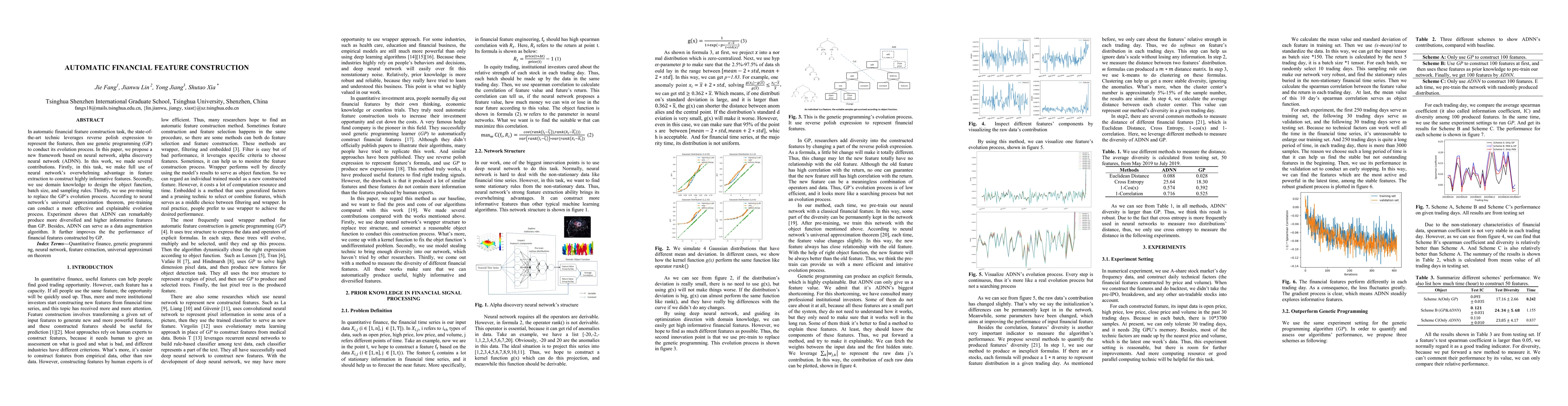 This paper introduces a novel neural network-based framework called Alpha Discovery Neural Network (ADNN) for automatic financial feature construction. ADNN leverages neural networks to extract highly informative features, incorporates domain knowledge into its design, and uses pre-training to replace the genetic programming evolution process, resulting in more diverse and informative features compared to traditional methods.