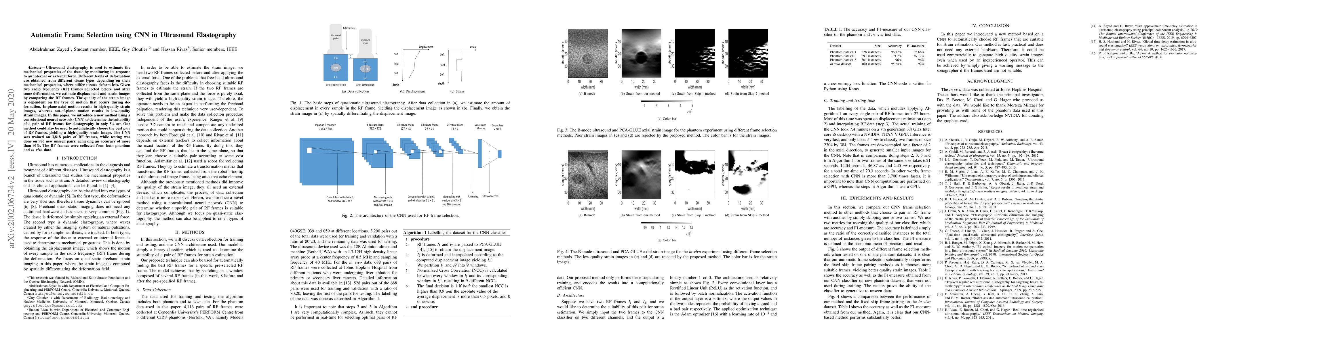 This research introduces a CNN-based method for automatic selection of RF frames suitable for elastography, trained on 3,818 pairs and tested on 986 unseen pairs, achieving over 91% accuracy in 5.4 ms.