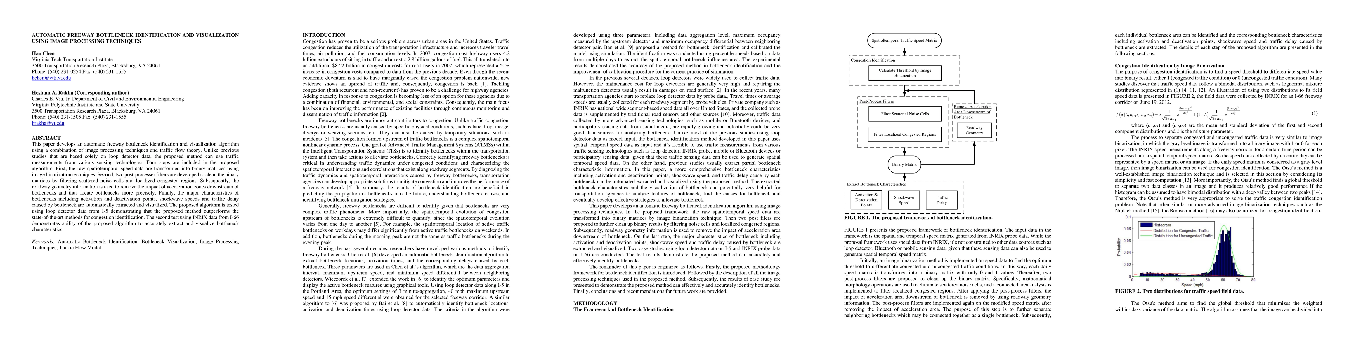 This paper presents an automatic freeway bottleneck identification and visualization algorithm using image processing and traffic flow theory, outperforming existing methods based on loop detector data. The algorithm transforms spatiotemporal speed data into binary matrices, applies filters for noise reduction, utilizes roadway geometry to refine bottleneck detection, and visualizes bottleneck characteristics.