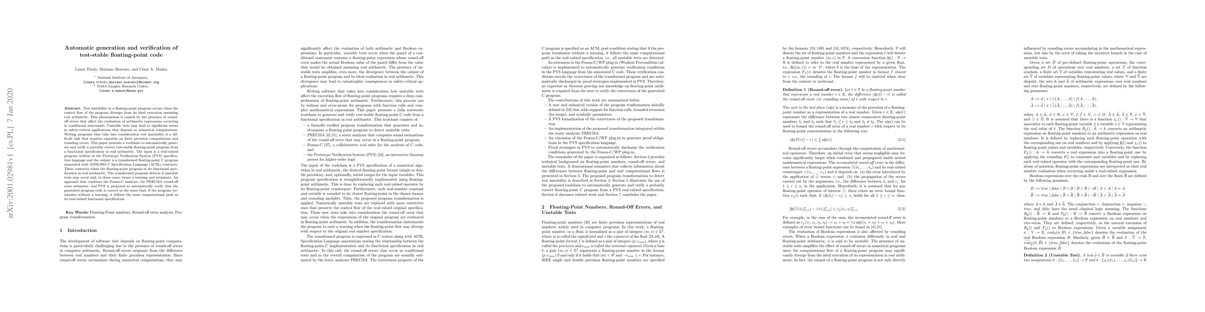 This paper introduces a toolchain for automatically generating and verifying test-stable floating-point code from real arithmetic specifications, addressing issues of round-off errors and test instability in numerical computations. The toolchain transforms real-valued programs into provably correct floating-point C code with verification using Frama-C, PRECiSA, and PVS.