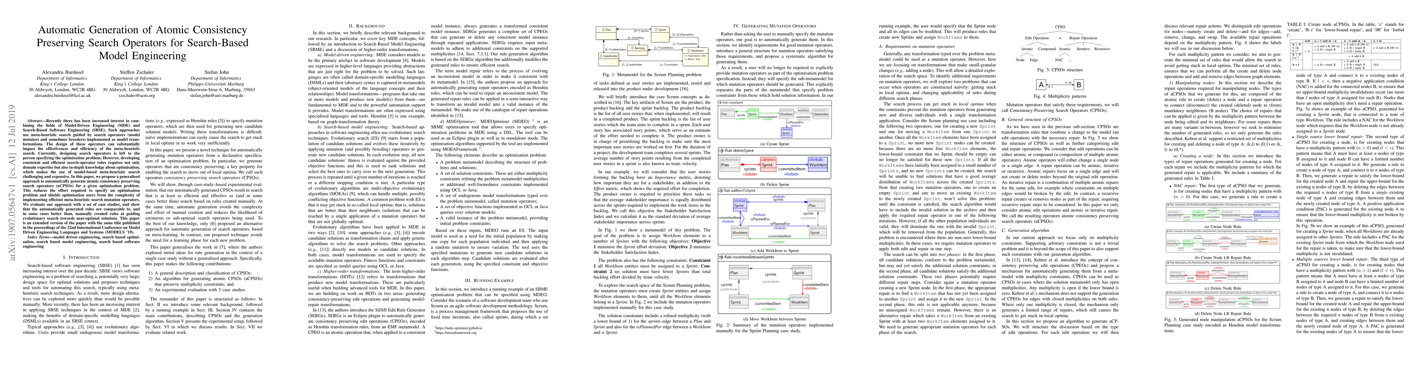 Recently there has been increased interest in combining the fields of Model-Driven Engineering (MDE) and Search-Based Software Engineering (SBSE). Such approaches use meta-heuristic search guided by search operators (model mutators and sometimes breeders) implemented as model transformations. The design of these operators can substantially impact the effectiveness and efficiency of the meta-heuristic search. Currently, designing search operators is left to the person specifying the optimisation problem. However, developing consistent and efficient search-operator rules requires not only domain expertise but also in-depth knowledge about optimisation, which makes the use of model-based meta-heuristic search challenging and expensive. In this paper, we propose a generalised approach to automatically generate atomic consistency preserving search operators (aCPSOs) for a given optimisation problem. This reduces the effort required to specify an optimisation problem and shields optimisation users from the complexity of implementing efficient meta-heuristic search mutation operators. We evaluate our approach with a set of case studies, and show that the automatically generated rules are comparable to, and in some cases better than, manually created rules at guiding evolutionary search towards near-optimal solutions. This paper is an extended version of the paper with the same title published in the proceedings of the 22nd International Conference on Model Driven Engineering Languages and Systems (MODELS '19).