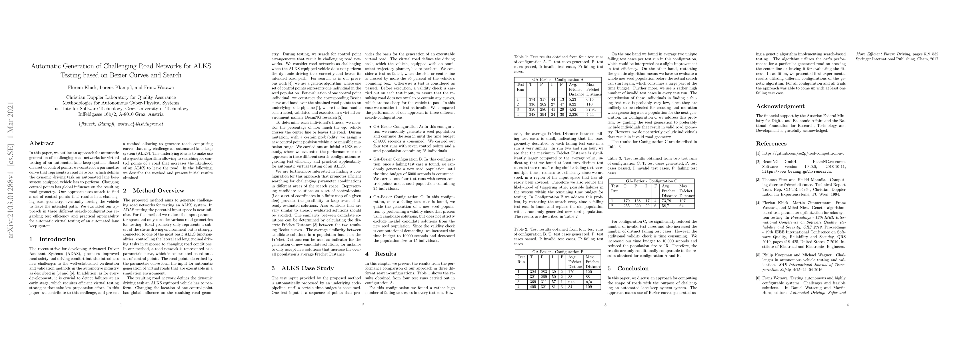 This paper presents an automatic method for generating complex road networks using Bezier curves and search algorithms to test automated lane keep systems. The approach adjusts control points to create challenging road geometries, evaluated in three search configurations for efficiency and practical application.