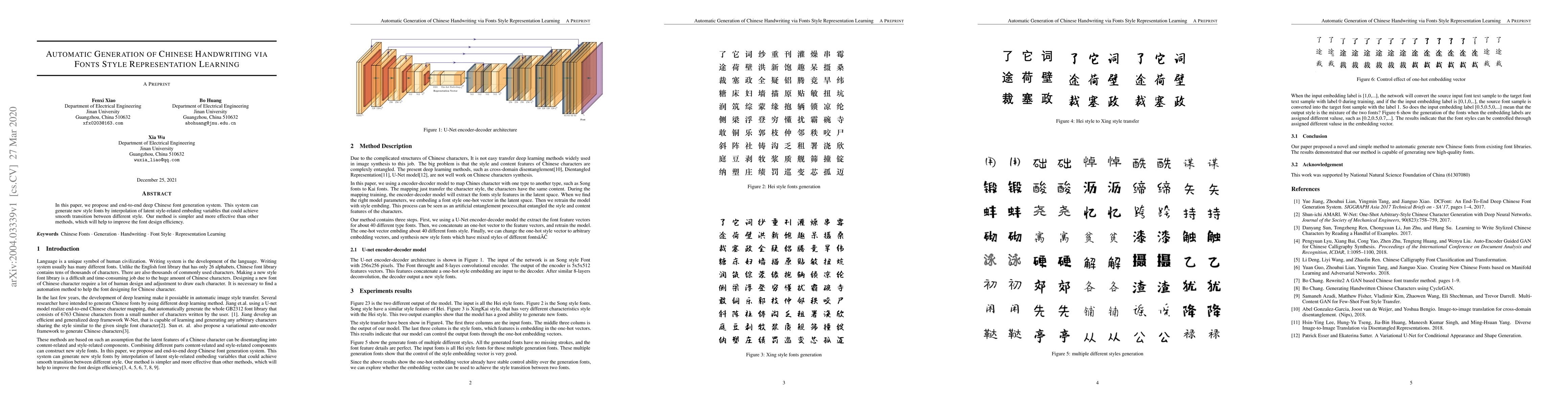Summary: This paper introduces an end-to-end deep learning system for generating new Chinese handwriting styles through latent style embeddings. The proposed method facilitates smooth transitions between styles, offering a simpler and more effective approach compared to existing methods, thereby enhancing font design efficiency.