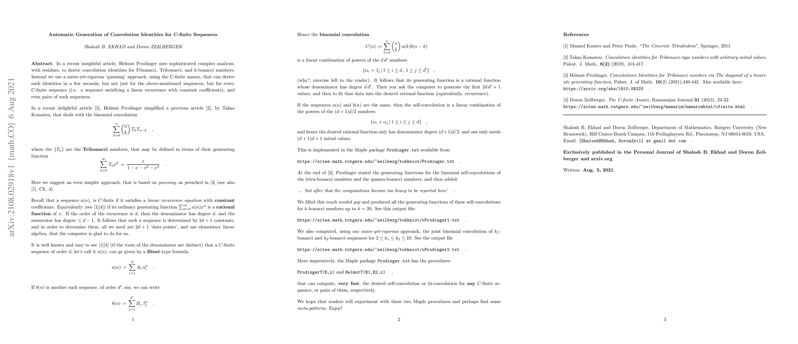 In a recent insightful article, Helmut Prodinger uses sophisticated complex analysis, with residues, to derive convolution identities for Fibonacci, Tribonacci, and k-bonacci numbers. Here we use a naive, "experimental mathematics" (yet fully rogorous!) approach, using the C-finite ansatz, that can derive such identities in a few seconds, but not just for the above-mentioned sequences, but for every C-finite sequence (i.e. a sequence satisfying a linear recurrence with constant coefficients), and even for a pair of these.