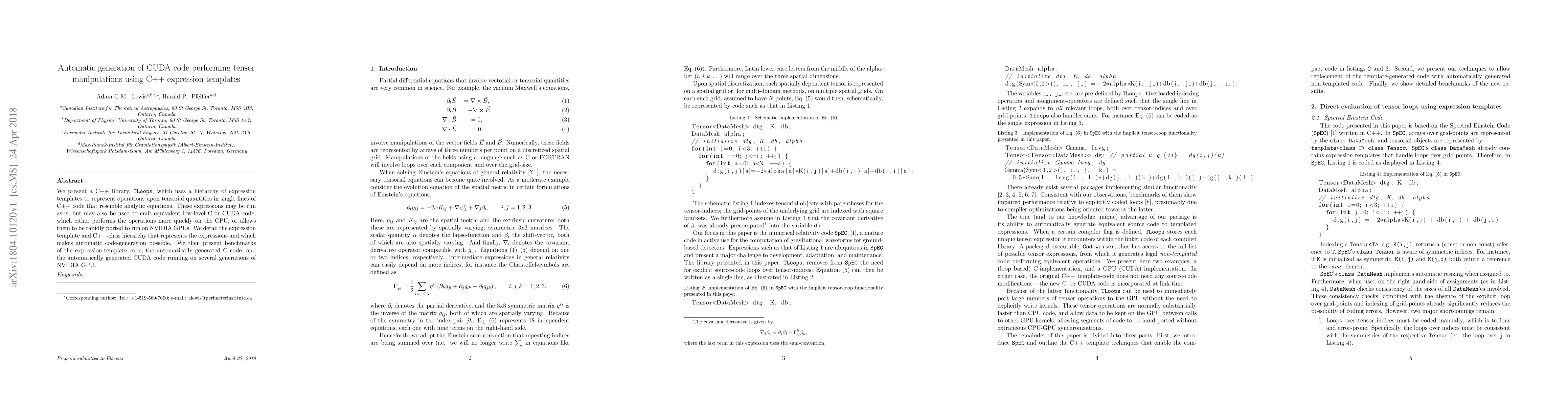 A C++ library called TLoops uses expression templates to generate efficient tensor manipulation code in C, CUDA, and CPU, achieving significant speedups on NVIDIA GPUs.