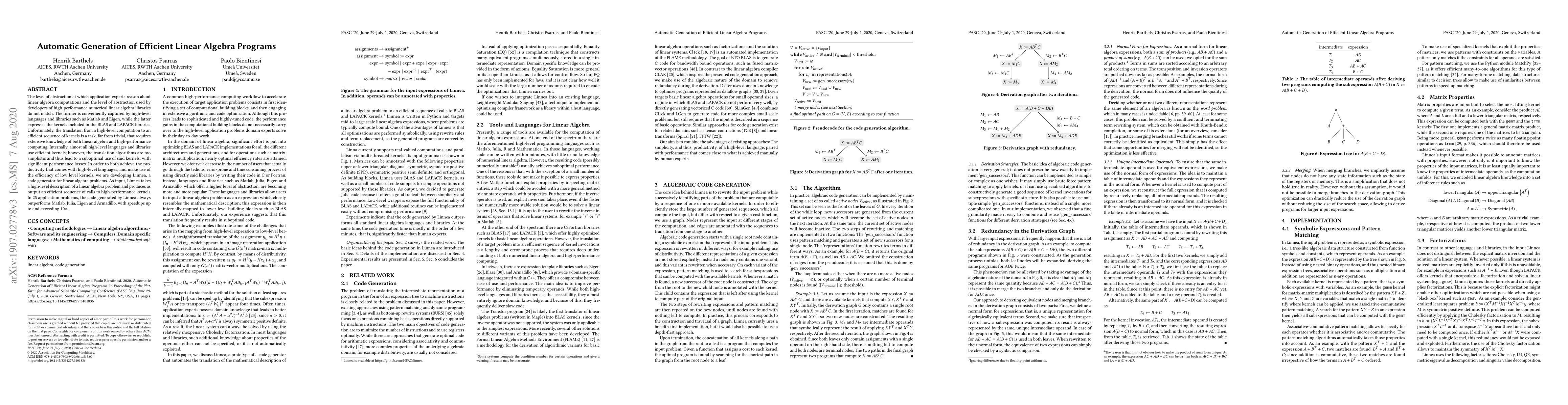 This paper introduces Linnea, a code generator that translates high-level linear algebra descriptions into efficient sequences of high-performance kernels, bridging the gap between application-level and low-level numerical libraries. In tests, Linnea's generated code outperforms Matlab, Julia, Eigen, and Armadillo, achieving up to 10x speedups.