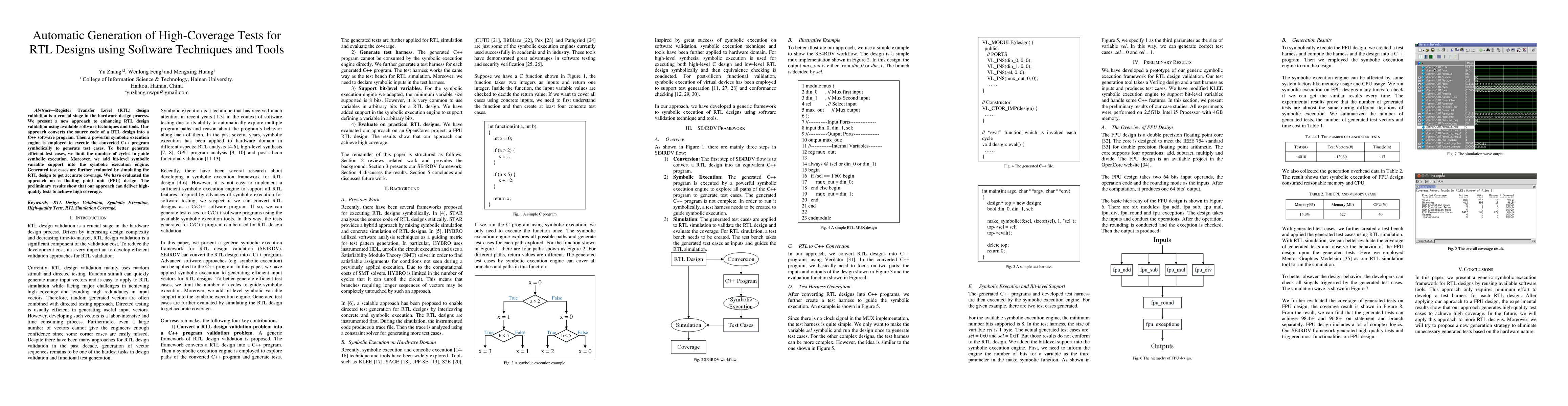 This paper introduces a novel method for generating high-coverage test cases for RTL designs by converting RTL source code into C++ and employing symbolic execution to create tests, with bit-level symbolic variable support. Preliminary results on an FPU design demonstrate the effectiveness of the approach in achieving high coverage.