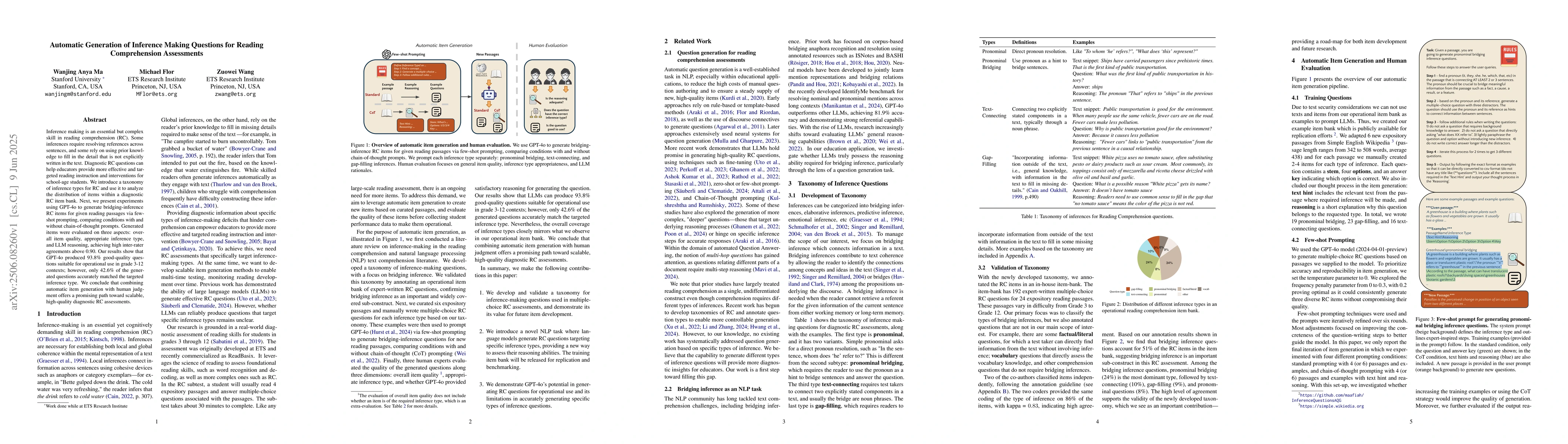 This work stands out by leveraging a large language model for automatic generation of inference-making questions for reading comprehension assessments, proposing a taxonomy of inference types, and emphasizing the importance of human evaluation to ensure quality and safety in educational applications.