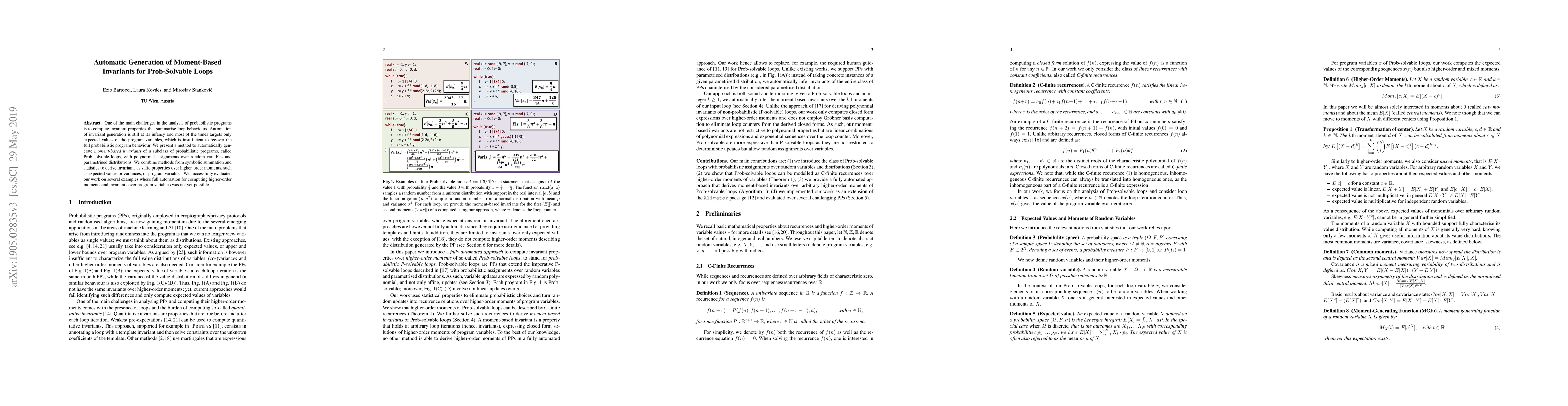 This paper introduces a novel method for automatically generating moment-based invariants for Prob-Solvable loops in probabilistic programs, leveraging symbolic summation and statistical techniques to derive higher-order moments beyond simple expected values, thus providing a more comprehensive analysis of loop behavior. The effectiveness of the approach is demonstrated through examples where traditional methods fall short.