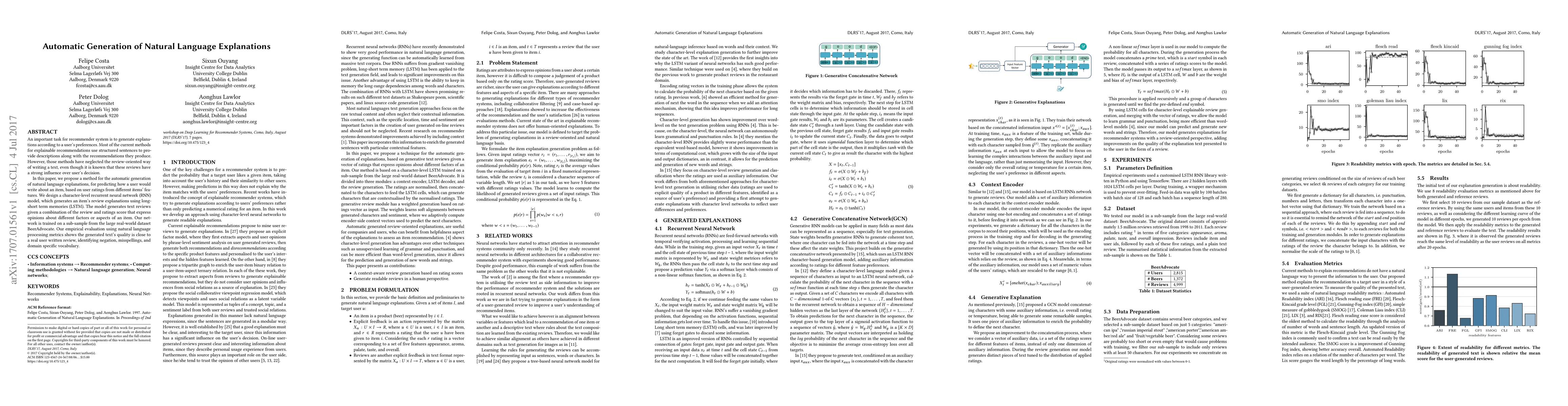 An important task for recommender system is to generate explanations according to a user's preferences. Most of the current methods for explainable recommendations use structured sentences to provide descriptions along with the recommendations they produce. However, those methods have neglected the review-oriented way of writing a text, even though it is known that these reviews have a strong influence over user's decision. In this paper, we propose a method for the automatic generation of natural language explanations, for predicting how a user would write about an item, based on user ratings from different items' features. We design a character-level recurrent neural network (RNN) model, which generates an item's review explanations using long-short term memories (LSTM). The model generates text reviews given a combination of the review and ratings score that express opinions about different factors or aspects of an item. Our network is trained on a sub-sample from the large real-world dataset BeerAdvocate. Our empirical evaluation using natural language processing metrics shows the generated text's quality is close to a real user written review, identifying negation, misspellings, and domain specific vocabulary.
