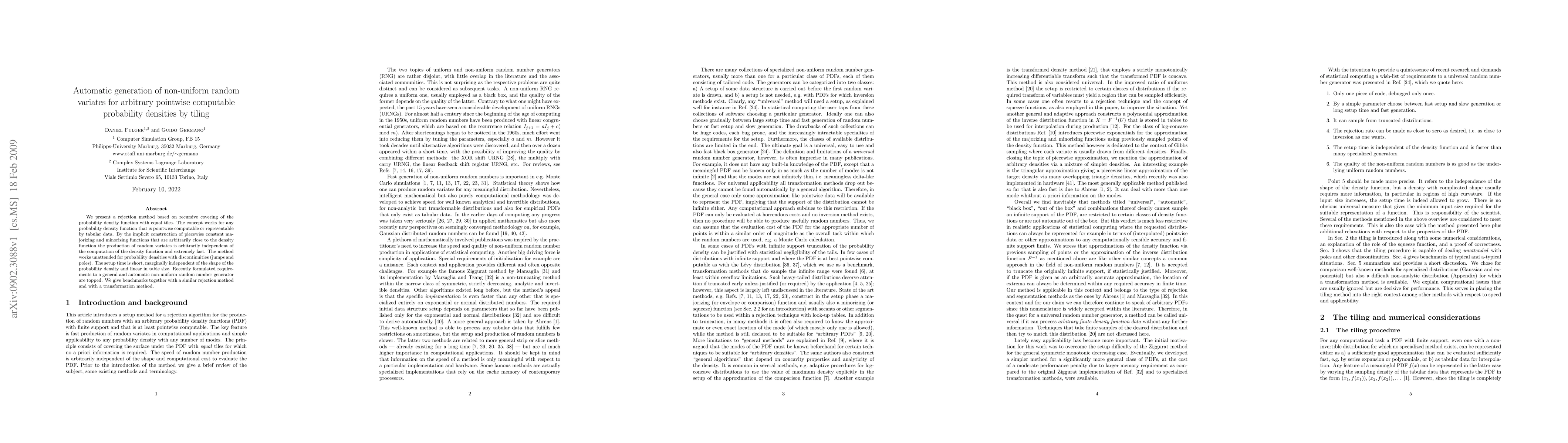 We present a rejection method based on recursive covering of the probability density function with equal tiles. The concept works for any probability density function that is pointwise computable or representable by tabular data. By the implicit construction of piecewise constant majorizing and minorizing functions that are arbitrarily close to the density function the production of random variates is arbitrarily independent of the computation of the density function and extremely fast. The method works unattended for probability densities with discontinuities (jumps and poles). The setup time is short, marginally independent of the shape of the probability density and linear in table size. Recently formulated requirements to a general and automatic non-uniform random number generator are topped. We give benchmarks together with a similar rejection method and with a transformation method.
