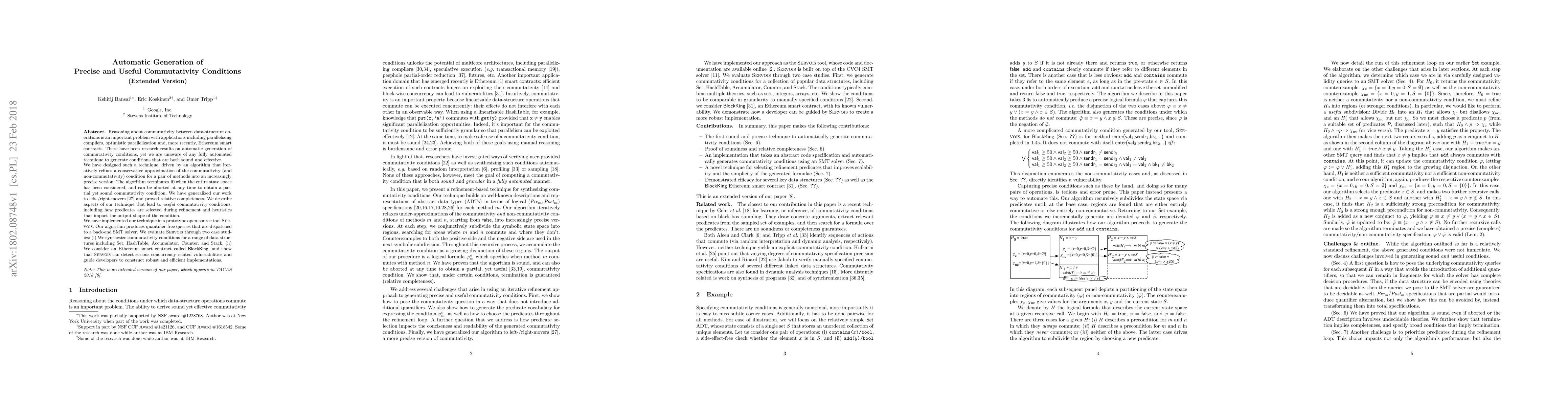 This paper presents a fully automated technique to generate precise and useful commutativity conditions for data-structure operations, which is crucial for parallelizing compilers and Ethereum smart contracts. The proposed algorithm iteratively refines commutativity conditions and can be aborted for partial yet sound results. The technique is implemented in the open-source tool Servois, which synthesizes conditions for various data structures and detects concurrency vulnerabilities in Ethereum smart contracts.