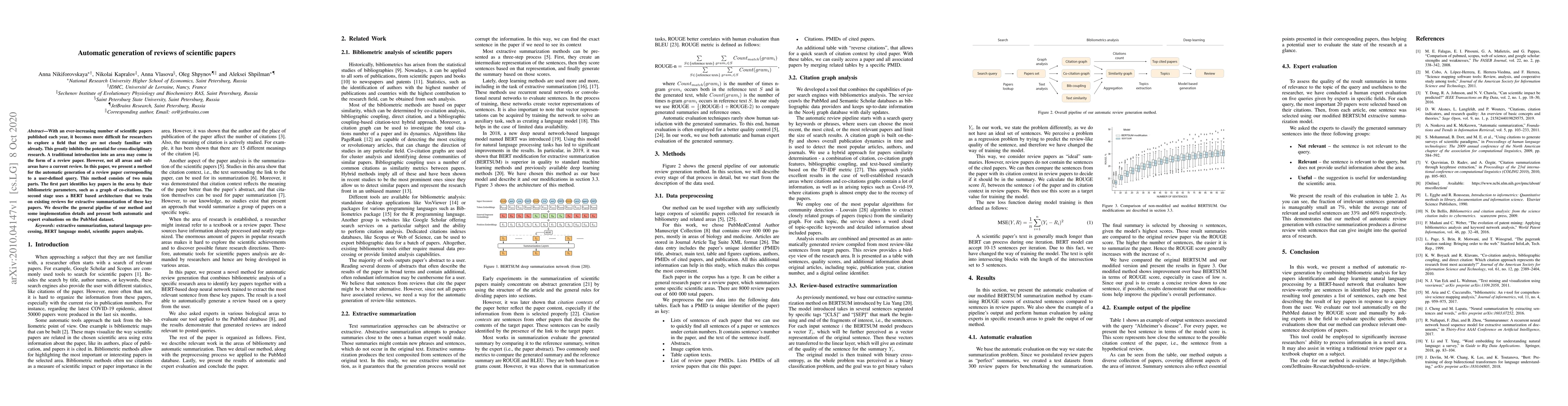 With an ever-increasing number of scientific papers published each year, it becomes more difficult for researchers to explore a field that they are not closely familiar with already. This greatly inhibits the potential for cross-disciplinary research. A traditional introduction into an area may come in the form of a review paper. However, not all areas and sub-areas have a current review. In this paper, we present a method for the automatic generation of a review paper corresponding to a user-defined query. This method consists of two main parts. The first part identifies key papers in the area by their bibliometric parameters, such as a graph of co-citations. The second stage uses a BERT based architecture that we train on existing reviews for extractive summarization of these key papers. We describe the general pipeline of our method and some implementation details and present both automatic and expert evaluations on the PubMed dataset.