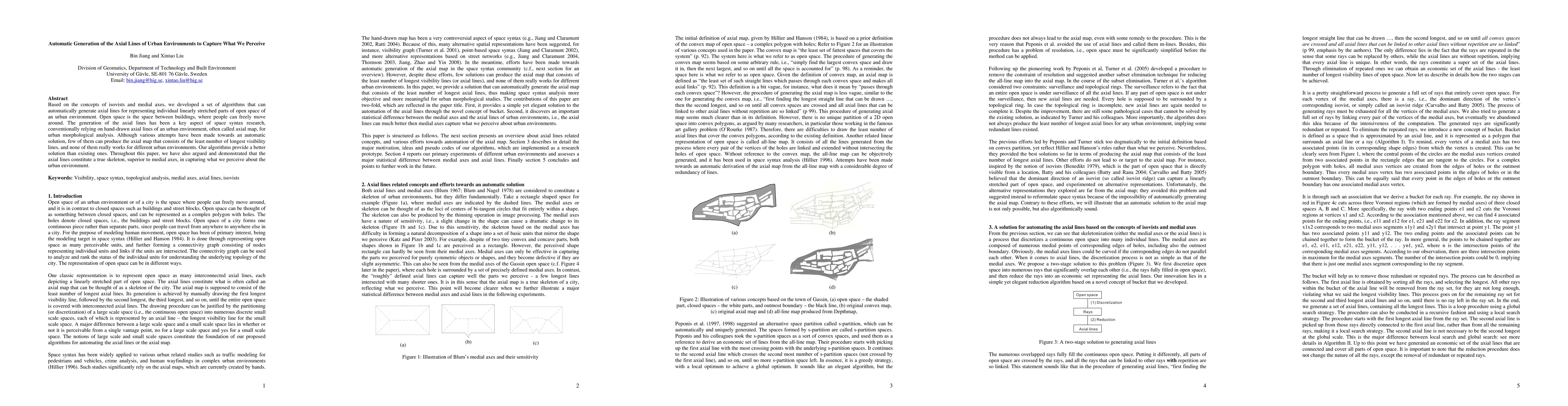 Based on the concepts of isovists and medial axes, we developed a set of algorithms that can automatically generate axial lines for representing individual linearly stretched parts of open space of an urban environment. Open space is the space between buildings, where people can freely move around. The generation of the axial lines has been a key aspect of space syntax research, conventionally relying on hand-drawn axial lines of an urban environment, often called axial map, for urban morphological analysis. Although various attempts have been made towards an automatic solution, few of them can produce the axial map that consists of the least number of longest visibility lines, and none of them really works for different urban environments. Our algorithms provide a better solution than existing ones. Throughout this paper, we have also argued and demonstrated that the axial lines constitute a true skeleton, superior to medial axes, in capturing what we perceive about the urban environment. Keywords: Visibility, space syntax, topological analysis, medial axes, axial lines, isovists