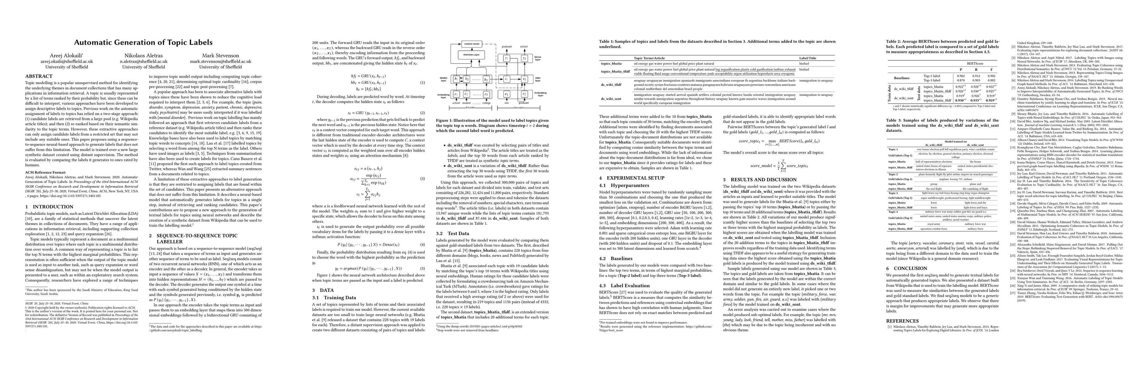 This paper proposes a sequence-to-sequence neural model for automatically generating descriptive topic labels from topic modelling outputs, overcoming limitations of previous extractive methods. The model is trained on a synthetic dataset and evaluated against human-rated labels.