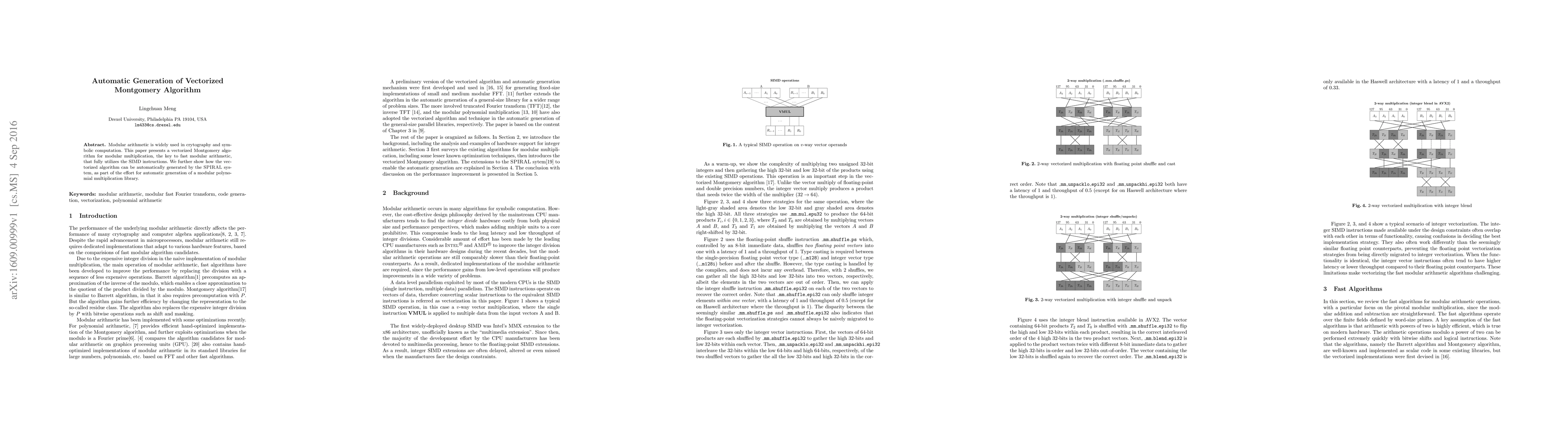 This paper introduces a vectorized Montgomery algorithm for efficient modular multiplication, leveraging SIMD instructions, and demonstrates its automatic generation using the {\SPIRAL} system to create a modular polynomial multiplication library.