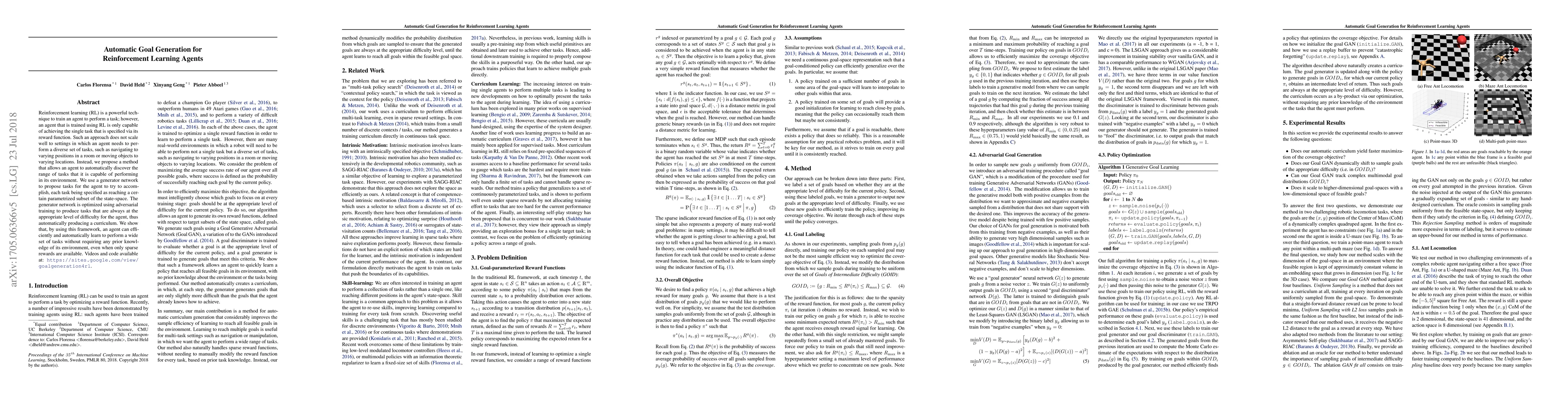 Researchers developed a method for automatic goal generation in reinforcement learning agents, enabling them to discover and learn diverse tasks without prior knowledge of their environment. This approach produces an efficient curriculum of tasks that can be learned with sparse rewards.