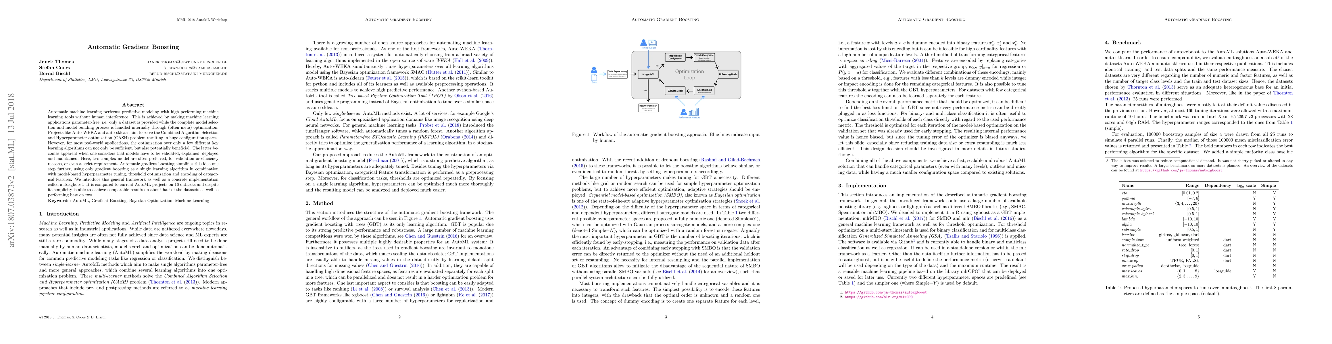 Automatic machine learning performs predictive modeling with high performing machine learning tools without human interference. This is achieved by making machine learning applications parameter-free, i.e. only a dataset is provided while the complete model selection and model building process is handled internally through (often meta) optimization. Projects like Auto-WEKA and auto-sklearn aim to solve the Combined Algorithm Selection and Hyperparameter optimization (CASH) problem resulting in huge configuration spaces. However, for most real-world applications, the optimization over only a few different key learning algorithms can not only be sufficient, but also potentially beneficial. The latter becomes apparent when one considers that models have to be validated, explained, deployed and maintained. Here, less complex model are often preferred, for validation or efficiency reasons, or even a strict requirement. Automatic gradient boosting simplifies this idea one step further, using only gradient boosting as a single learning algorithm in combination with model-based hyperparameter tuning, threshold optimization and encoding of categorical features. We introduce this general framework as well as a concrete implementation called autoxgboost. It is compared to current AutoML projects on 16 datasets and despite its simplicity is able to achieve comparable results on about half of the datasets as well as performing best on two.