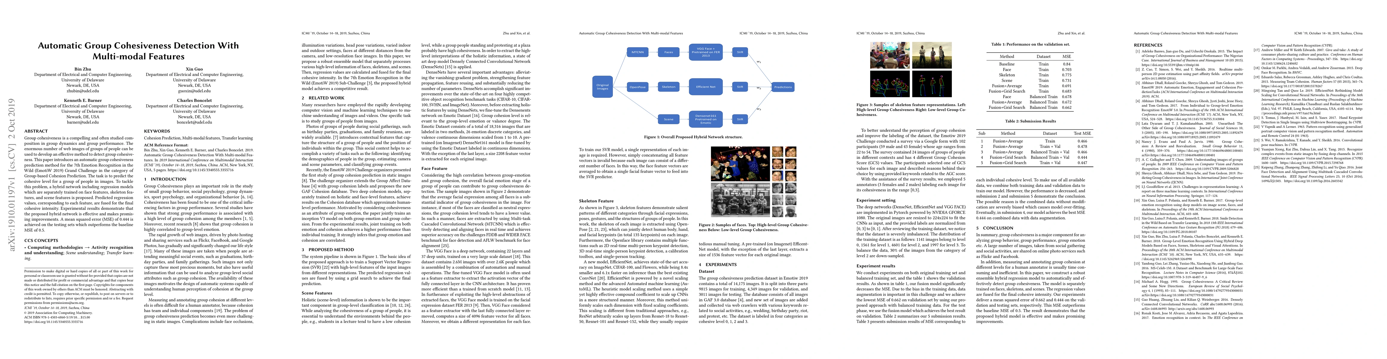 A new method for detecting group cohesiveness in images uses a hybrid network that combines face, skeleton, and scene features to predict the level of cohesion within a group. The approach achieved promising results, with a mean squared error of 0.444 on testing sets.