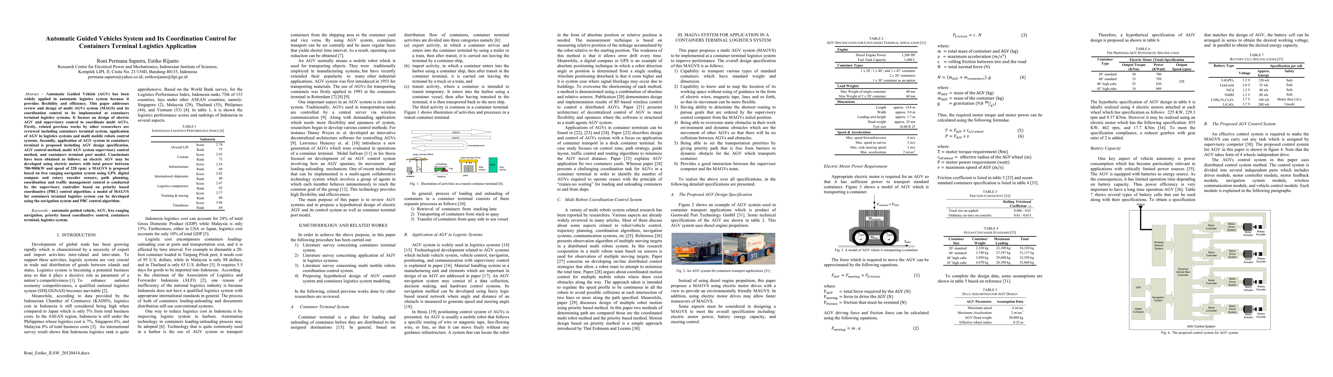 Automatic Guided Vehicle (AGV) has been widely applied in automatic logistics system because it provides flexibility and efficiency. This paper addresses review and design of multi AGVs system (MAGS) and its coordination control to be implemented at containers terminal logistics systems. It focuses on design of electric AGV and supervisory control to coordinate multi AGVs. Firstly, related previous works by other researchers are reviewed including containers terminal system, application of AGV in logistics systems and multi mobile robots control systems. Secondly, application of AGV system in containers terminal is proposed including AGV design specification, AGV control method, multi AGV system supervisory control method, and containers terminal port model. Conclusions have been obtained as follows: an electric AGV may be developed using electric motors with total power between 700-900KW and speed of 228 rpm; a MAGVS is proposed based on free ranging navigation system using GPS, digital compass and rotary encoder sensors; path planning, coordination and traffic management control is conducted by the supervisory controller based on priority based coordinative (PBC) control algorithm; a model of MAGVS for containers terminal logistics system can be developed using the navigation system and PBC control algorithm.