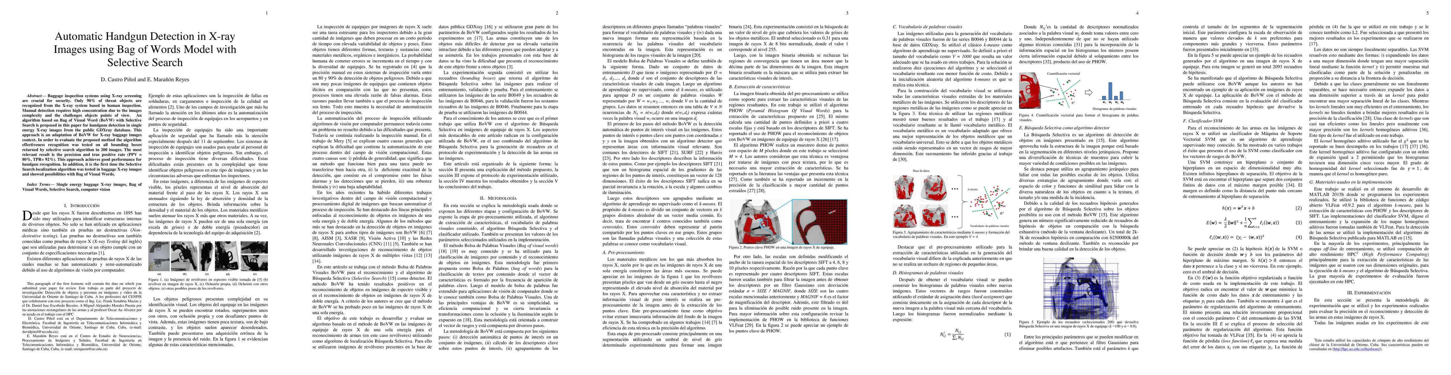 A proposed algorithm using Bag of Visual Words with Selective Search improves handgun detection in X-ray images to 80% precision and 92% true positive rate.