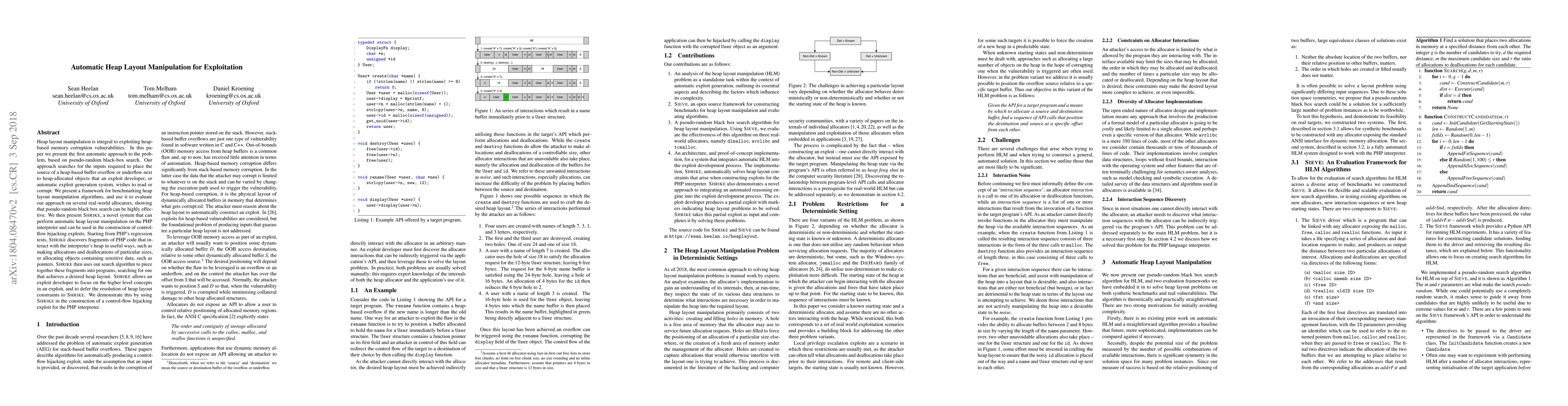 Heap layout manipulation is integral to exploiting heap-based memory corruption vulnerabilities. In this paper we present the first automatic approach to the problem, based on pseudo-random black-box search. Our approach searches for the inputs required to place the source of a heap-based buffer overflow or underflow next to heap-allocated objects that an exploit developer, or automatic exploit generation system, wishes to read or corrupt. We present a framework for benchmarking heap layout manipulation algorithms, and use it to evaluate our approach on several real-world allocators, showing that pseudo-random black box search can be highly effective. We then present SHRIKE, a novel system that can perform automatic heap layout manipulation on the PHP interpreter and can be used in the construction of control-flow hijacking exploits. Starting from PHP's regression tests, SHRIKE discovers fragments of PHP code that interact with the interpreter's heap in useful ways, such as making allocations and deallocations of particular sizes, or allocating objects containing sensitive data, such as pointers. SHRIKE then uses our search algorithm to piece together these fragments into programs, searching for one that achieves a desired heap layout. SHRIKE allows an exploit developer to focus on the higher level concepts in an exploit, and to defer the resolution of heap layout constraints to SHRIKE. We demonstrate this by using SHRIKE in the construction of a control-flow hijacking exploit for the PHP interpreter.