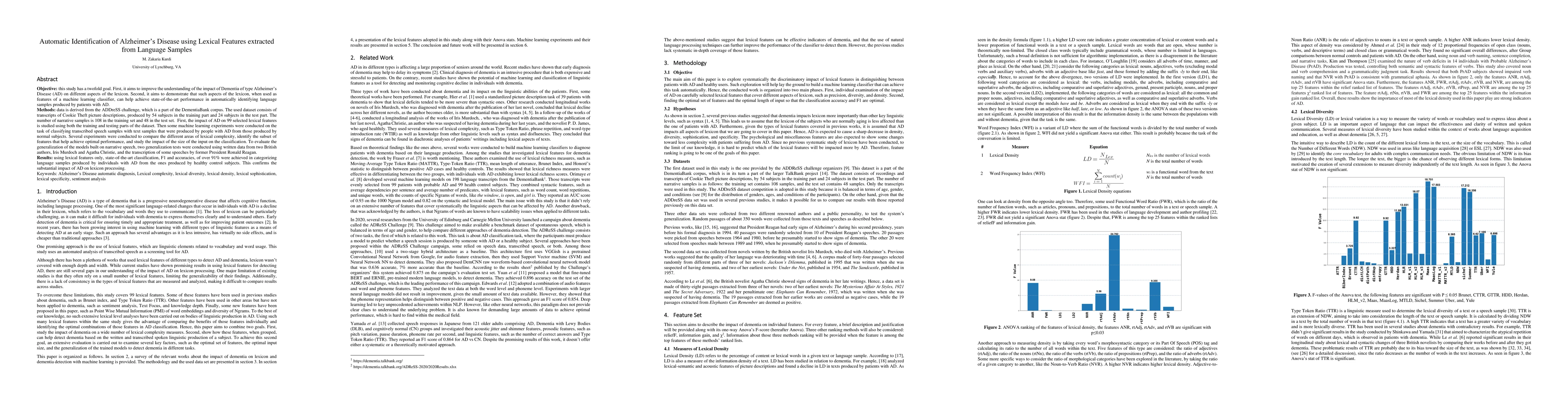 This study investigates the impact of Alzheimer's Disease on lexical features in language samples and demonstrates that these features can achieve over 91% accuracy in classifying speech from AD patients versus healthy controls, highlighting the significant influence of AD on lexical processing.