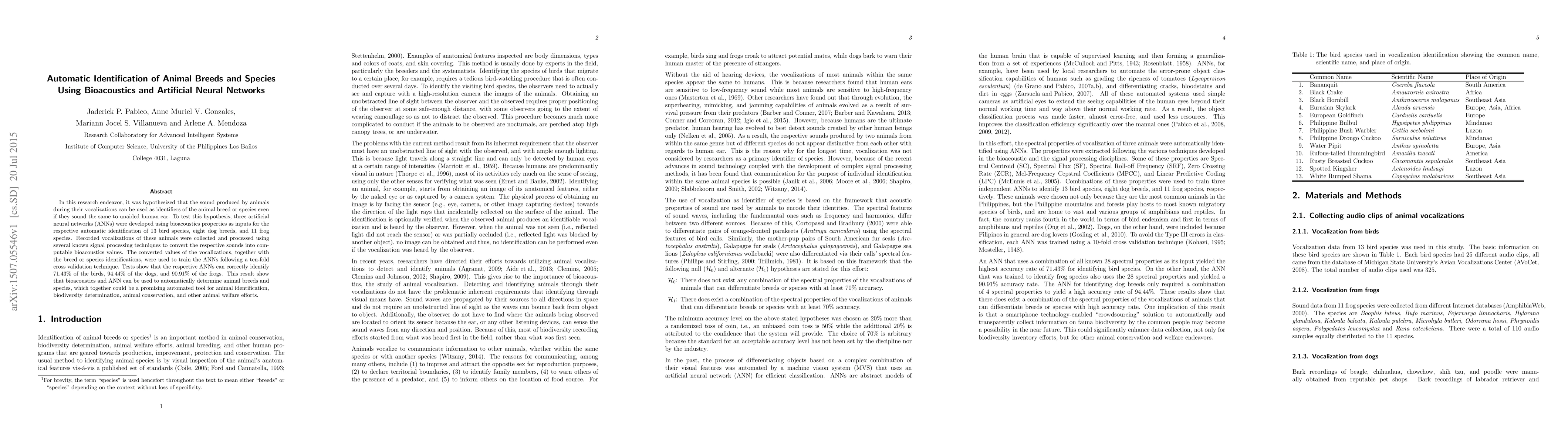 This research developed three artificial neural networks (ANNs) using bioacoustics properties of animal vocalizations to identify 13 bird species, eight dog breeds, and 11 frog species. Recorded vocalizations were processed into computable bioacoustics values, which were then used to train the ANNs via a ten-fold cross-validation technique.