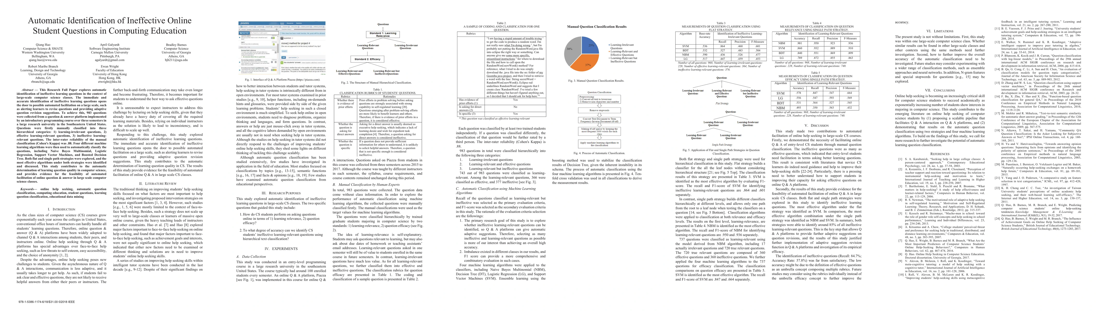 This paper investigates the automatic identification of ineffective learning questions in large-scale computer science classes using machine learning algorithms. The study classifies questions from an online platform and identifies the most effective algorithms for this task, contributing to the feasibility of automated facilitation in large programming courses.