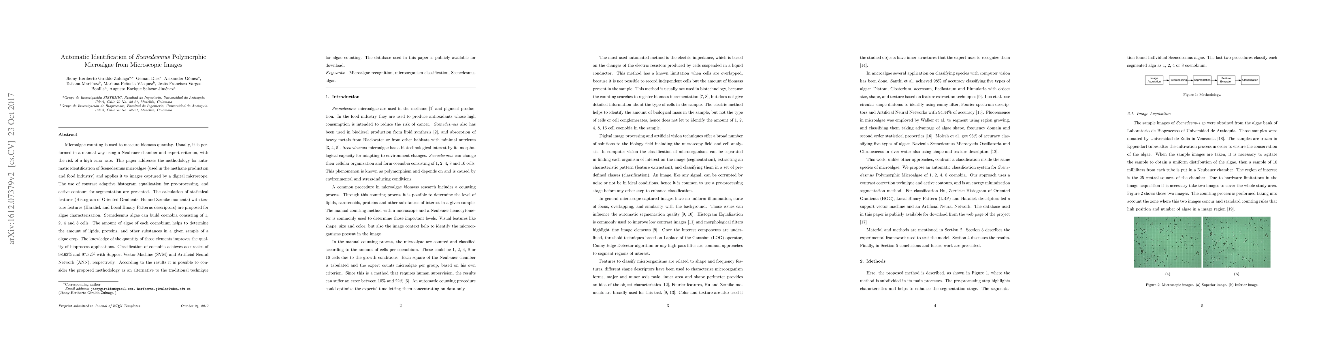 Microalgae counting is used to measure biomass quantity. Usually, it is performed in a manual way using a Neubauer chamber and expert criterion, with the risk of a high error rate. This paper addresses the methodology for automatic identification of Scenedesmus microalgae (used in the methane production and food industry) and applies it to images captured by a digital microscope. The use of contrast adaptive histogram equalization for pre-processing, and active contours for segmentation are presented. The calculation of statistical features (Histogram of Oriented Gradients, Hu and Zernike moments) with texture features (Haralick and Local Binary Patterns descriptors) are proposed for algae characterization. Scenedesmus algae can build coenobia consisting of 1, 2, 4 and 8 cells. The amount of algae of each coenobium helps to determine the amount of lipids, proteins, and other substances in a given sample of a algae crop. The knowledge of the quantity of those elements improves the quality of bioprocess applications. Classification of coenobia achieves accuracies of 98.63% and 97.32% with Support Vector Machine (SVM) and Artificial Neural Network (ANN), respectively. According to the results it is possible to consider the proposed methodology as an alternative to the traditional technique for algae counting. The database used in this paper is publicly available for download.
