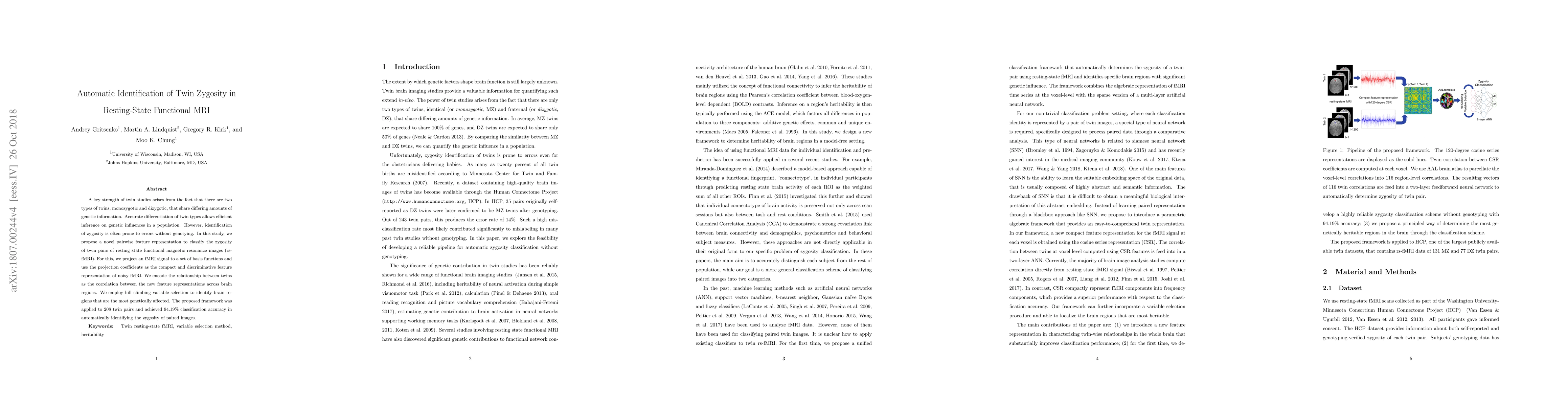 A key strength of twin studies arises from the fact that there are two types of twins, monozygotic and dizygotic, that share differing amounts of genetic information. Accurate differentiation of twin types allows efficient inference on genetic influences in a population. However, identification of zygosity is often prone to errors without genotying. In this study, we propose a novel pairwise feature representation to classify the zygosity of twin pairs of resting state functional magnetic resonance images (rs-fMRI). For this, we project an fMRI signal to a set of basis functions and use the projection coefficients as the compact and discriminative feature representation of noisy fMRI. We encode the relationship between twins as the correlation between the new feature representations across brain regions. We employ hill climbing variable selection to identify brain regions that are the most genetically affected. The proposed framework was applied to 208 twin pairs and achieved 94.19% classification accuracy in automatically identifying the zygosity of paired images.