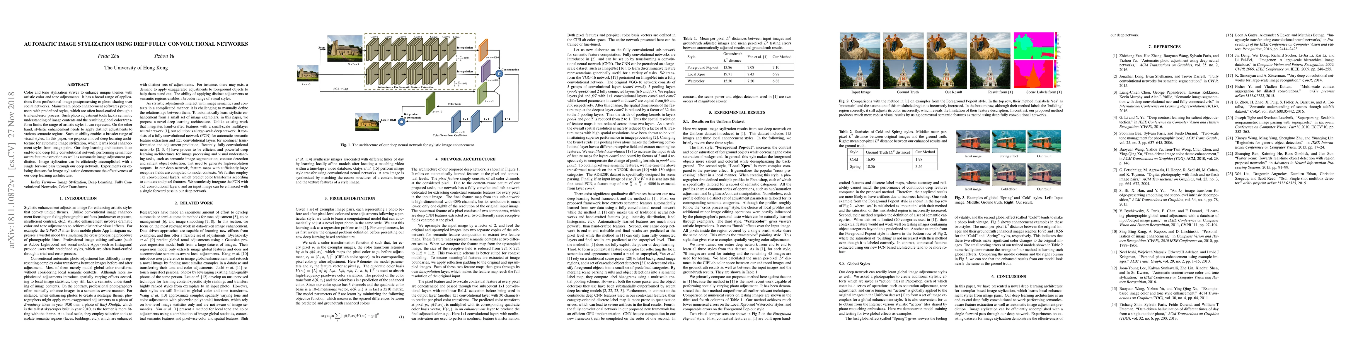 This paper proposes a deep fully convolutional network for automatic image stylization that learns local enhancement styles from image pairs, enabling semantics-aware feature extraction and automatic adjustment prediction, thus achieving broader visual styles with a single forward pass. Experiments show the effectiveness of the proposed method in enhancing images with artistic styles.