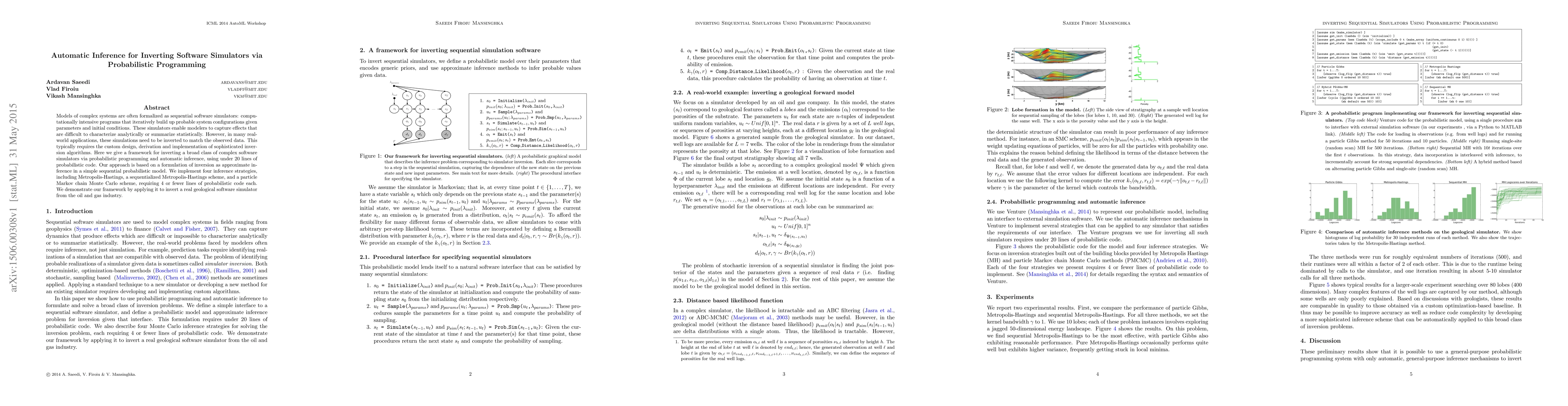 This paper presents a framework for automatically inverting complex software simulators using probabilistic programming and automatic inference, requiring minimal probabilistic code. The authors implement four inference strategies and demonstrate the approach by inverting a geological simulator to match observed data.