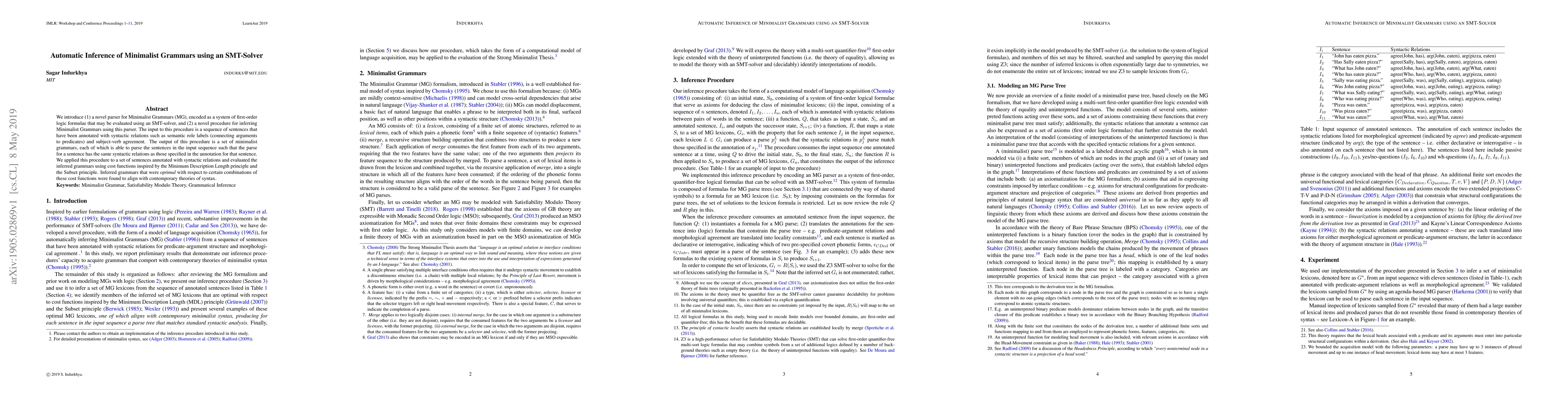 The work is novel in its application of SMT-solvers for inferring Minimalist Grammars and its evaluation using cost functions inspired by the Minimum Description Length principle and the Subset principle.