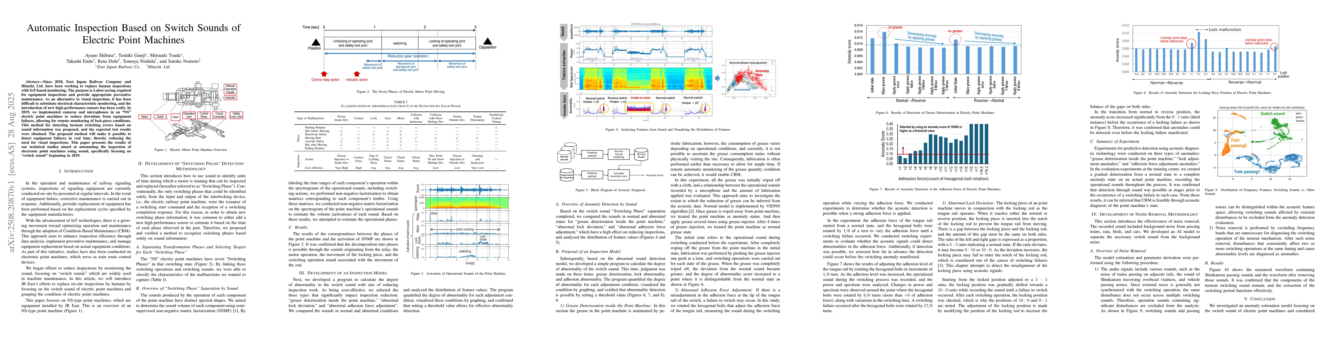 Since 2018, East Japan Railway Company and Hitachi, Ltd. have been working to replace human inspections with IoT-based monitoring. The purpose is Labor-saving required for equipment inspections and provide appropriate preventive maintenance. As an alternative to visual inspection, it has been difficult to substitute electrical characteristic monitoring, and the introduction of new high-performance sensors has been costly. In 2019, we implemented cameras and microphones in an ``NS'' electric point machines to reduce downtime from equipment failures, allowing for remote monitoring of lock-piece conditions. This method for detecting turnout switching errors based on sound information was proposed, and the expected test results were obtained. The proposed method will make it possible to detect equipment failures in real time, thereby reducing the need for visual inspections. This paper presents the results of our technical studies aimed at automating the inspection of electronic point machines using sound, specifically focusing on ``switch sound'' beginning in 2019.