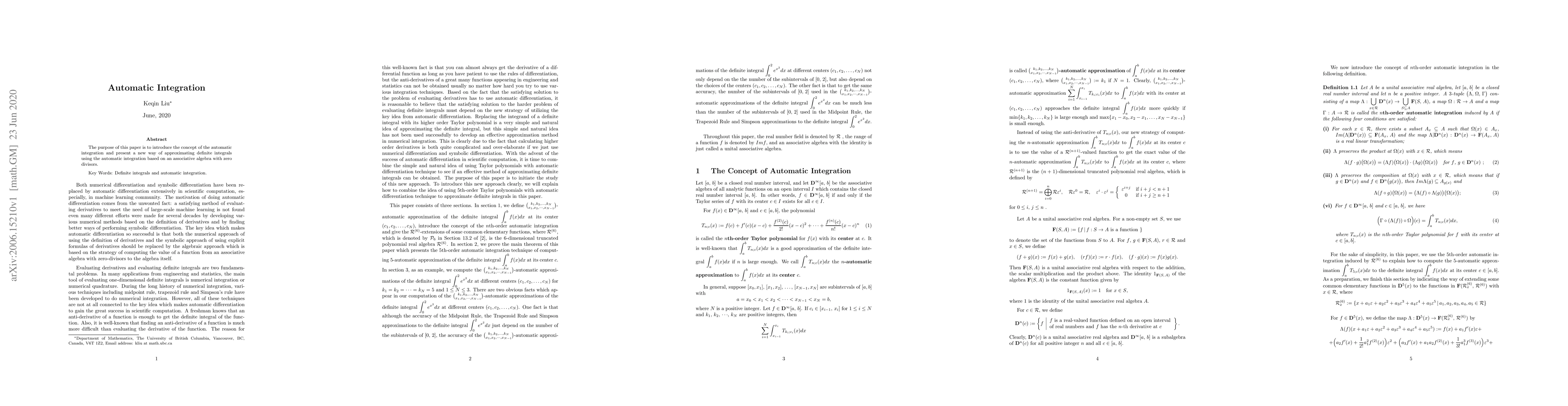 The purpose of this paper is to introduce the concept of the automatic integration and present a new way of approximating definite integrals using the automatic integration based on an associative algebra with zero divisors.