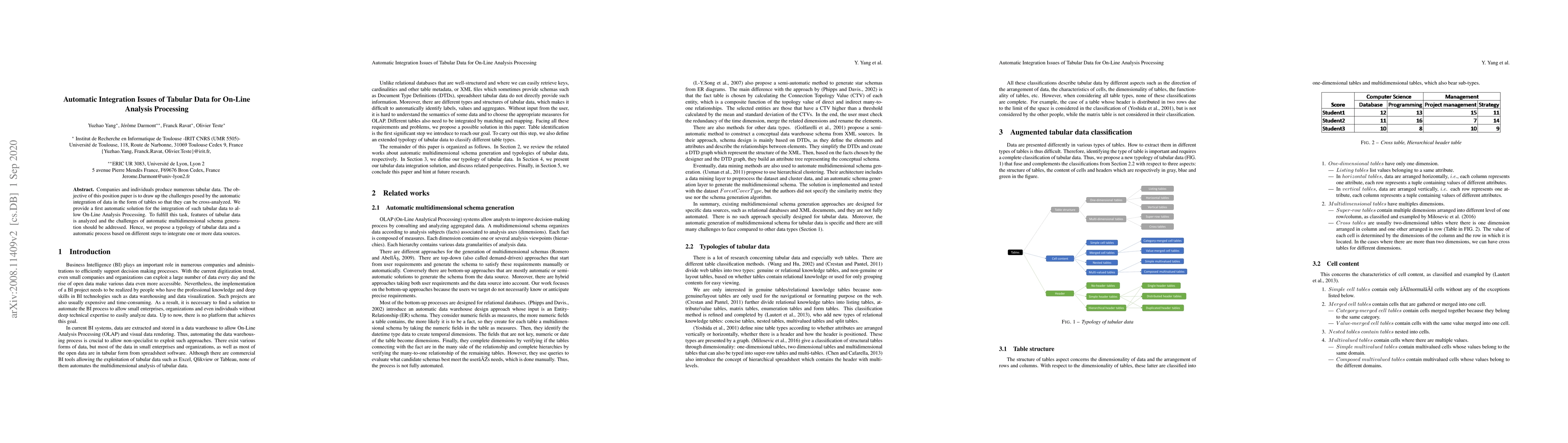 This paper addresses the challenges of automatically integrating tabular data for cross-analysis, proposing a typology of such data and introducing an automatic solution for multidimensional schema generation to enable On-Line Analysis Processing.